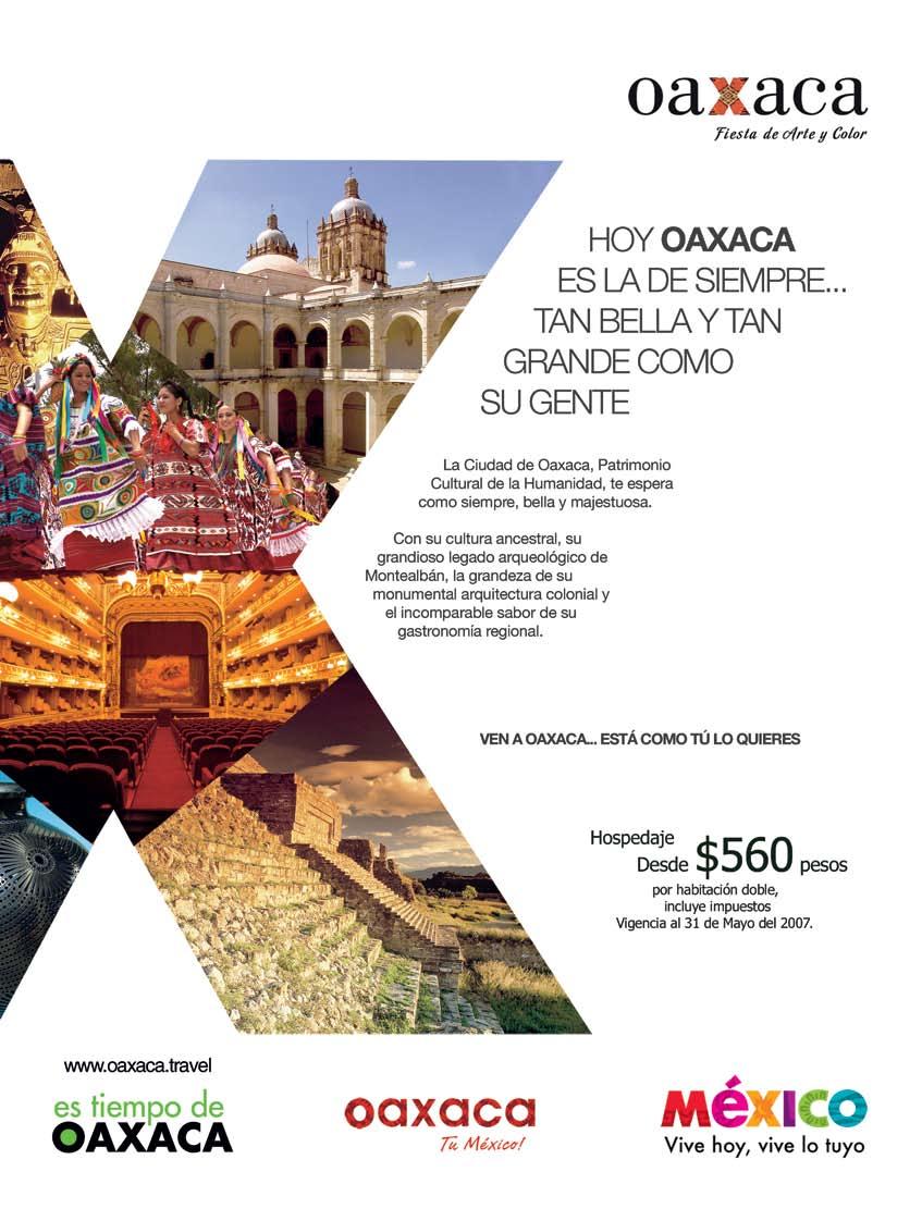 Otro ciclo. Sí, en estas páginas hay una muestra más sobre el tema, y se trata de Oaxaca, un destino como pocos, que ha logrado cerrar un ciclo de conflicto para entrar en un nuevo ciclo mucho más benevolente, incluso prometedor. Oaxaca entra ya en un ciclo que seguramente la llevará no sólo a recuperar su esplendor de antaño, sino a ofrecer nuevos y mejores productos, que la continúen