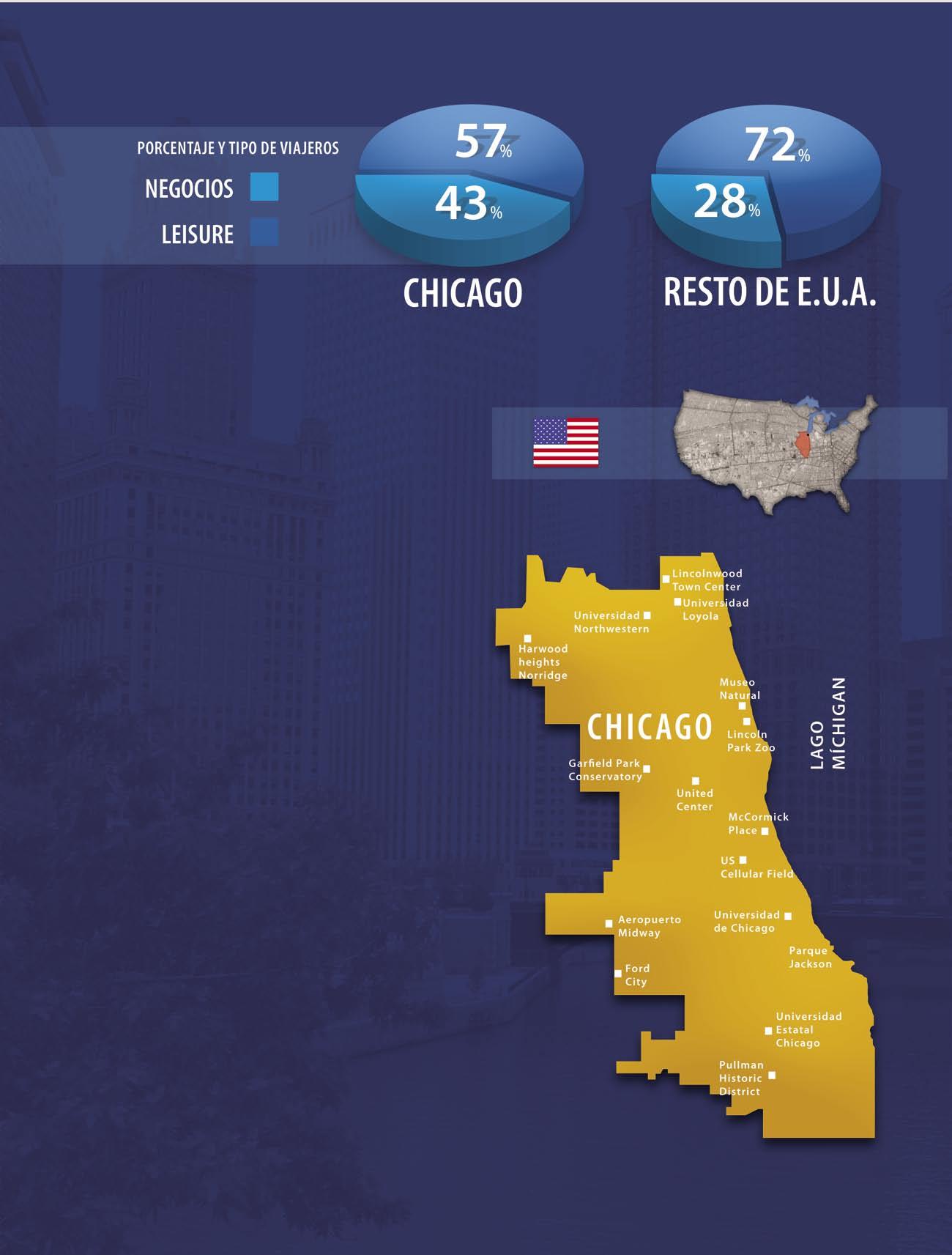 13.7 millones de personas viajan a Chicago anualmente por negocios, más que a cualquier otro destino de la Unión Americana. gran parte, la importancia que hoy tiene para la economía estadounidense: desde 1848, cuando se convirtió en sitio de paso obligado en la ruta comercial Illinois-Michigan, su crecimiento ha sido constante. A pesar de que en el año de 1871 fue azotada por un incendio que la redujo a cenizas, esta imponente ciudad logró reconstruirse para mejorar, y cada vez fue atrayendo más turistas hasta sus tierras. El punto de inicio oficial en la historia de Chicago como destino turístico se dio en 1893, cuando fue sede de la World Columbian Exposition, que atrajo a más 27 millones de visitantes sólo durante el evento. Desde entonces, la ciudad de los rascacielos se ha convertido en uno de los referentes necesarios en lo que a turismo de negocios se refiere, y uno de los destinos más importantes de Estados Unidos y el mundo.