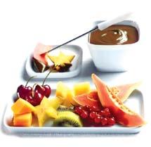 Fondue de C ho C olate Este es el momento para rescatar la fuente de chocolate que probablemente está en el área de banquetes sin mucho uso. Ofrecer fruta, pedacitos de panqué o pastel, galletas, malvaviscos para bañarlos. Es ideal buscar una colocación que permita que los comensales lleguen por varios ángulos para ayudar al flujo.