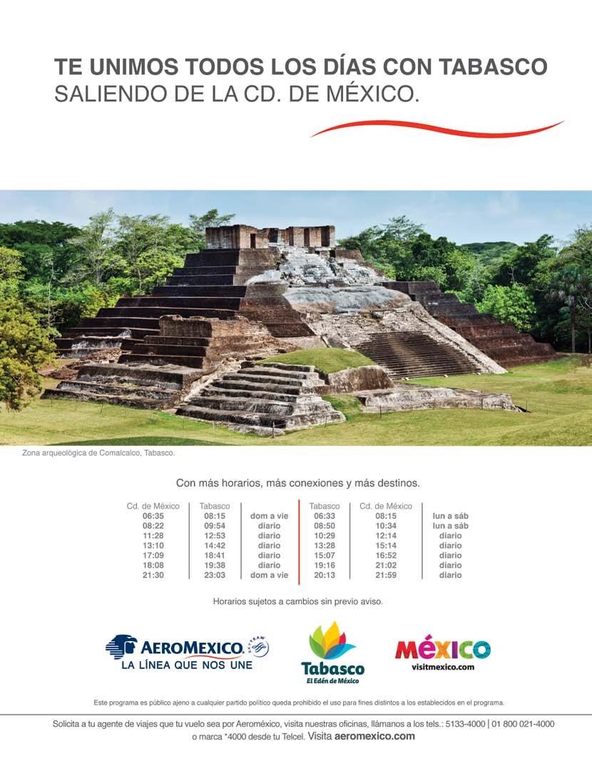 Tabasco, estado del sureste mexicano, cuna de las culturas ol meca y maya donde exuberantes selvas y abundantes cuerpos acuíferos ofrecen al visitante un abanico de ambientes tropicales que rodean a la ciudad más moderna del sureste mexicano, Villa hermosa. Tabasco es además uno de los principales productores de cacao del país, por lo que su oferta cultural está íntimamente ligada con este fruto y sus derivados. Desde talleres hasta catas de chocolate, los recorridos por plantaciones de cacao en hacien das centenarias, hacen de la visita a Tabasco un intenso y aromá tico encuentro con el manjar de los dioses.