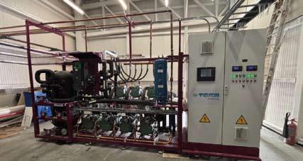 El sistema, implementado por el contratista local Dicoma Corporation, ofrece 950kW de capacidad a temperatura media, 510kW a baja temperatura y 246kW para calefacción. Además, recupera calor para el piso de las cámaras de congelación y cuenta con un sistema independiente de deshielo por gas caliente.