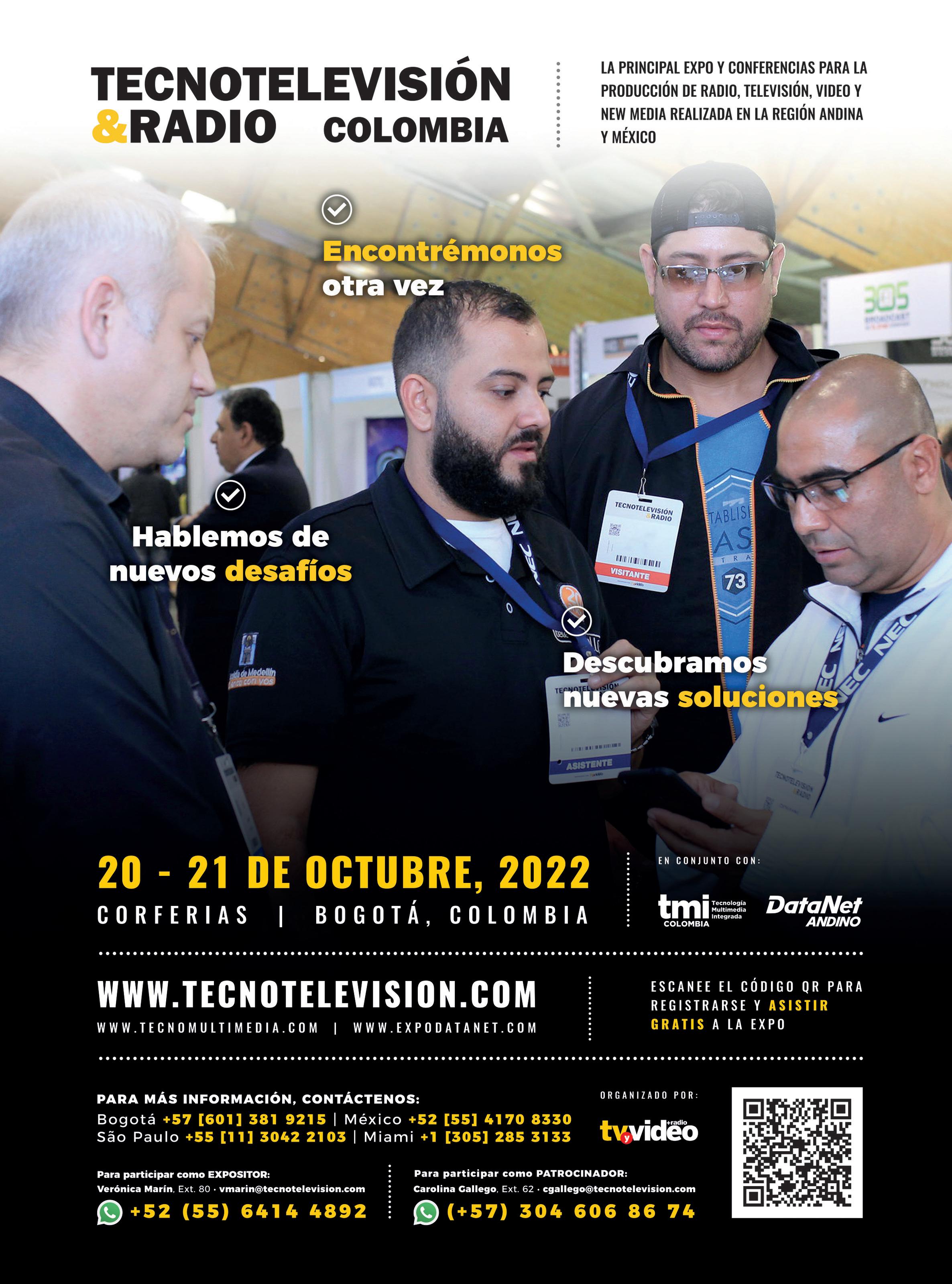 Los días jueves 20 y viernes 21 de octubre de 2022, en el pabellón 4 de Corferias, se rea lizará nuevamente TecnoTelevisión&Radio, la feria más importante de tecnologías para la producción de video, televisión y radio de Colombia. Nuevamente compartirá piso de exhibición con TecnoMultimedia Colombia y ExpoDatanet.