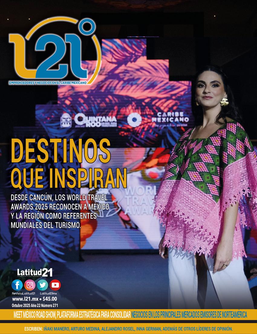 L21, Año 2025, número 271 es una publicación mensual de Grupo Editorial Latitud 21, S.A. de C.V. con domicilio en Av. Banco Chinchorro Manzana 1 Lote 8 Local 4 PB Supermanzana. 13, Código Postal 77504 Cancún, Quintana Roo México Tel: 99 88 92 86 66. Editor Responsable, Nelly García. Con certificado de reserva de derechos al uso exclusivo otorgado por el Instituto Nacional del Derecho de Autor 04-2013-011709563500102, ISSN 1665-9007, Certificado de Licitud de Título en trámite. Certificado de Licitud de Contenido en trámite. Impresa por Digitalización Publicitaria S.A. de C.V. Calle 39, No. 501, Col. Centro, C.P. 97000, Mérida Yucatán. Distribuida por Grupo Editorial Latitud 21, S.A. de C.V. PROHIBIDA LA REPRODUCCIÓN PARCIAL O TOTAL DEL CONTENIDO EDITORIAL Y FOTOGRAFICO SIN CONSENTIMIENTO POR ESCRITO DE LOS EDITORES.
