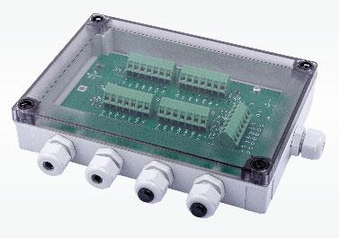 AISI 304 stainless steel or ABS junction boxes, including equalization boards or parallel connection boards, to connect from 1 to 4 or from 5 to 8 load cells. Hygienic junction boxes. Versions with lightning and electrical shock protection device.