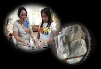 Measure 1 teaspoon of powdered nuts and 1 teaspoon of fine Herba Buena leaves and ginger powder; Put the mixture of Talisay nuts powder, fine herba Buena dried leaves and ginger powder inside the tea bag or filter.