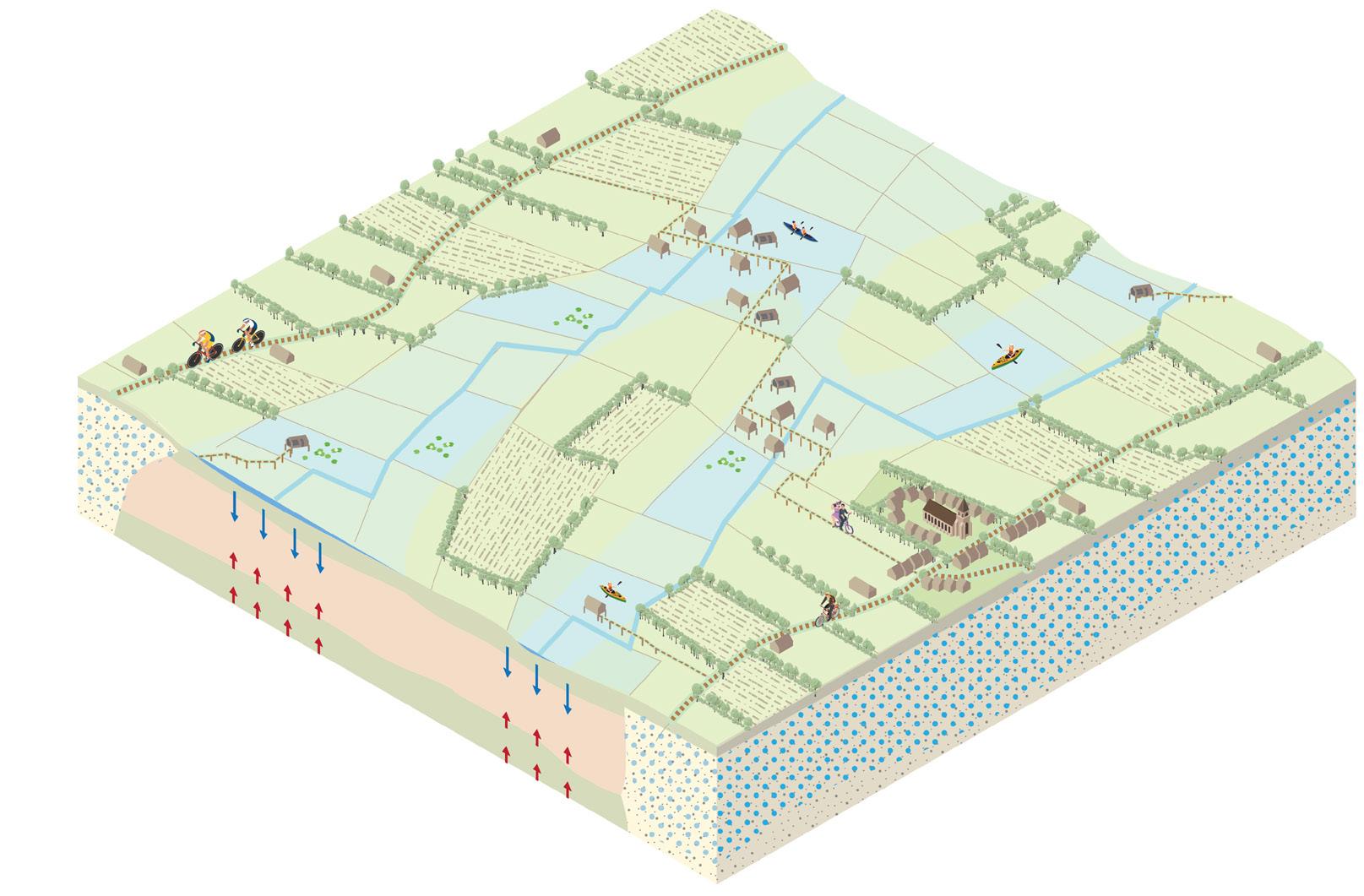 • Nieuwland: Laat bedijkt. Minder sterke relatie tussen bodem en gebruik: rationeel ingedeelde gronden met dijken als beeldbepalende elementen. Kreekruggen liggen laag in het landschap.