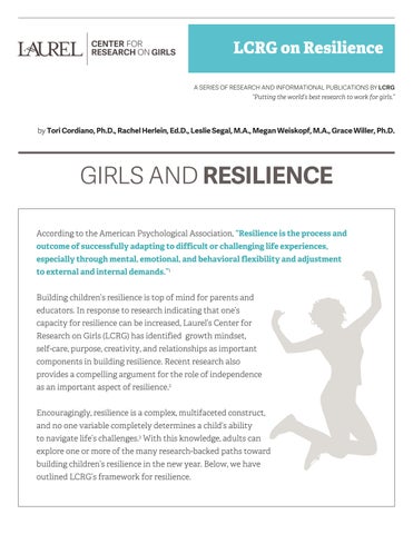 GIRLS AND RESILIENCE According to the American Psychological Association, “Resilience is the process and outcome of successfully adapting to difficult or challenging life experiences, especially through mental, emotional, and behavioral flexibility and adjustment to external and internal demands.”1 Building children’s resilience is top of mind for parents and educators. In response to research indicating that one’s capacity for resilience can be increased, Laurel’s Center for Research on Girls (LCRG) has identified growth mindset, self-care, purpose, creativity, and relationships as important components in building resilience. Recent research also provides a compelling argument for the role of independence as an important aspect of resilience.2 Encouragingly, resilience is a complex, multifaceted construct, and no one variable completely determines a child’s ability to navigate life’s challenges.3 With this knowledge, adults can explore one or more of the many research-backed paths toward building children’s resilience in the new year. Below, we have outlined LCRG’s framework for resilience.