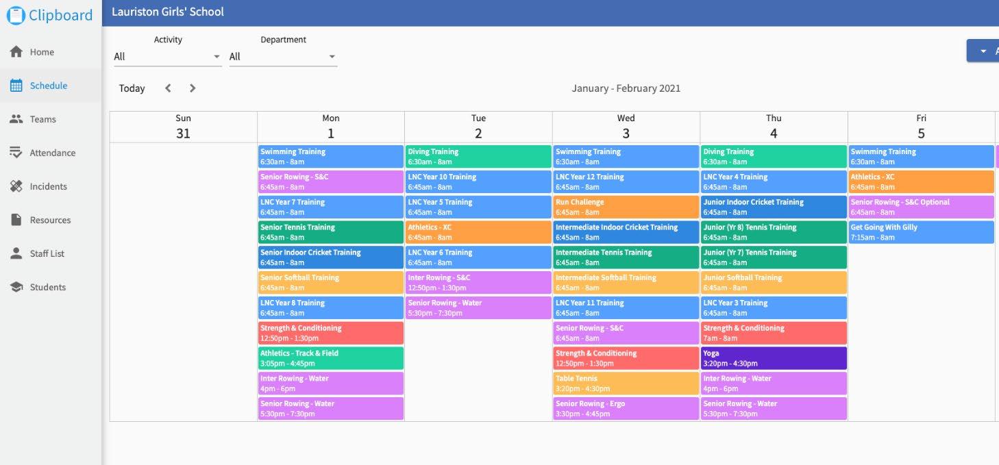 The link to your child’s sport calendar can be found on your School Parent Portal page. Below is an example of the Clipboard weekly calendar.