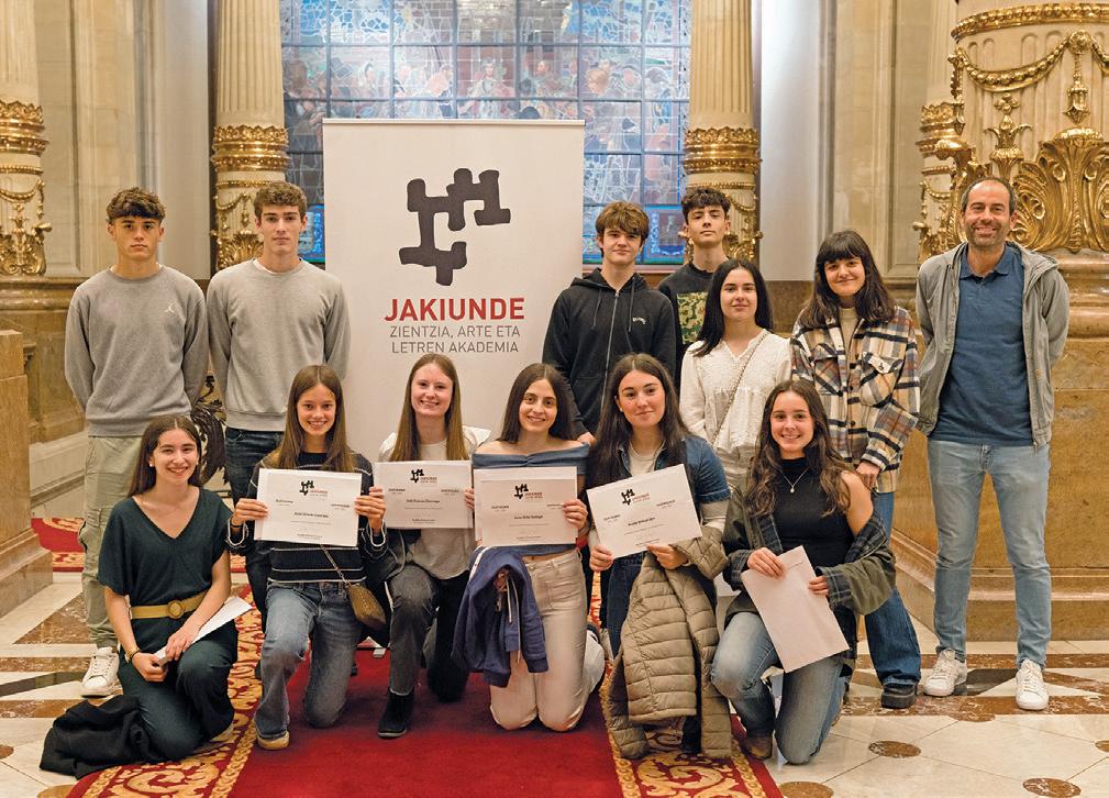 Los alumnos y alumnas que participaron en el programa JakinMina que organiza la Academia de las Ciencias, las Artes y las Letras, JAKIUNDE, recibieron el reconocimiento oficial y diploma de manos de la Diputada General, Elixabete Etxanobe Landajuela. Los estudiantes acudieron a la sede de la Diputación Foral de Bizkaia, acompañados por el responsable de la ESO Asier Etxebarrieta. Jakiunde, la Academia de las Ciencias, las Artes y las Letras, ofrece Al alumnado de 4º de ESO el programa JAKIN-MINA para apoyar su desarrollo intelectual y personal, participando en conferencias y presentaciones de expertos de reconocido prestigio en al menos cuatro disciplinas, en algunos casos, también en inglés. Estas charlas tienen lugar fuera del horario lectivo, los viernes, y los alumnos y alumnas acuden de forma voluntaria.