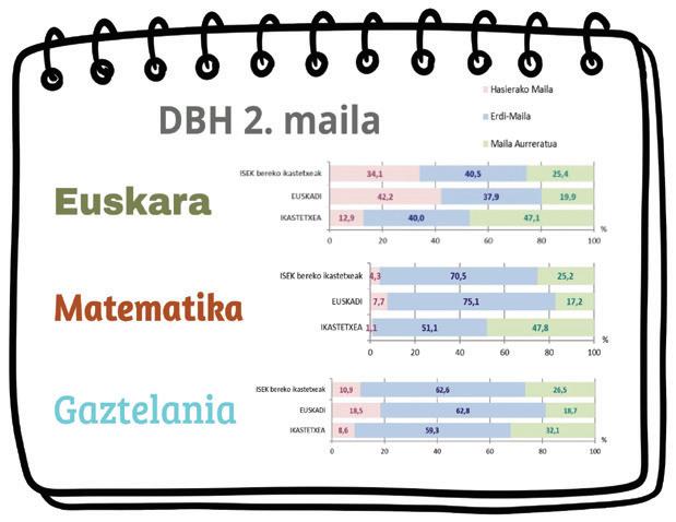 DBH 2. maila: DBHko datuei dagokienez, emaitzarik onenak izan genituen bai Euskadirekin alderatuta zein gure ISEK bereko ikastetxeekin alderatuta ere, eta bereziki deigarriak dira Matematikakoak, ikasleen ia %100a maila ertain eta aurreratuan baitaude.