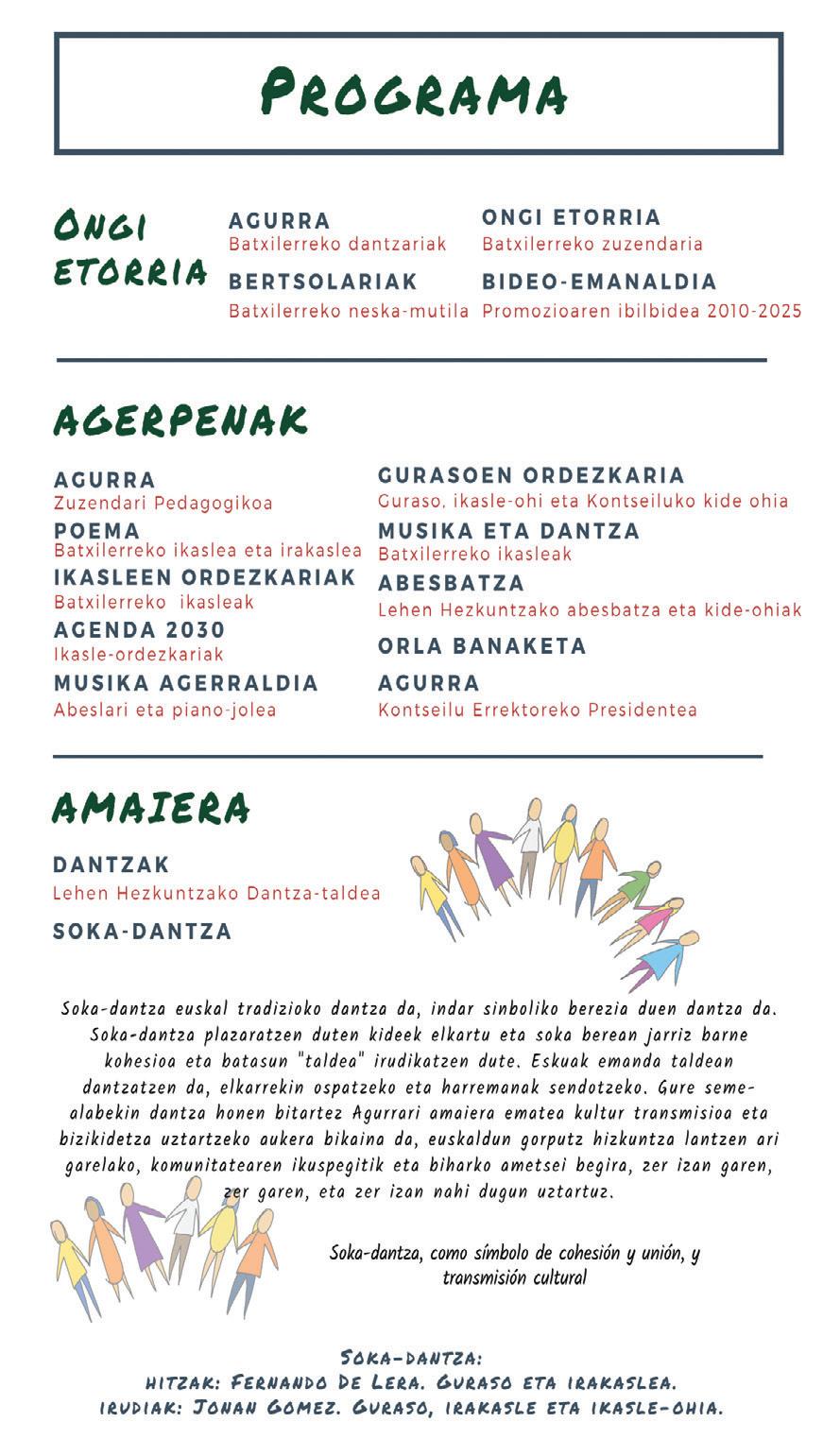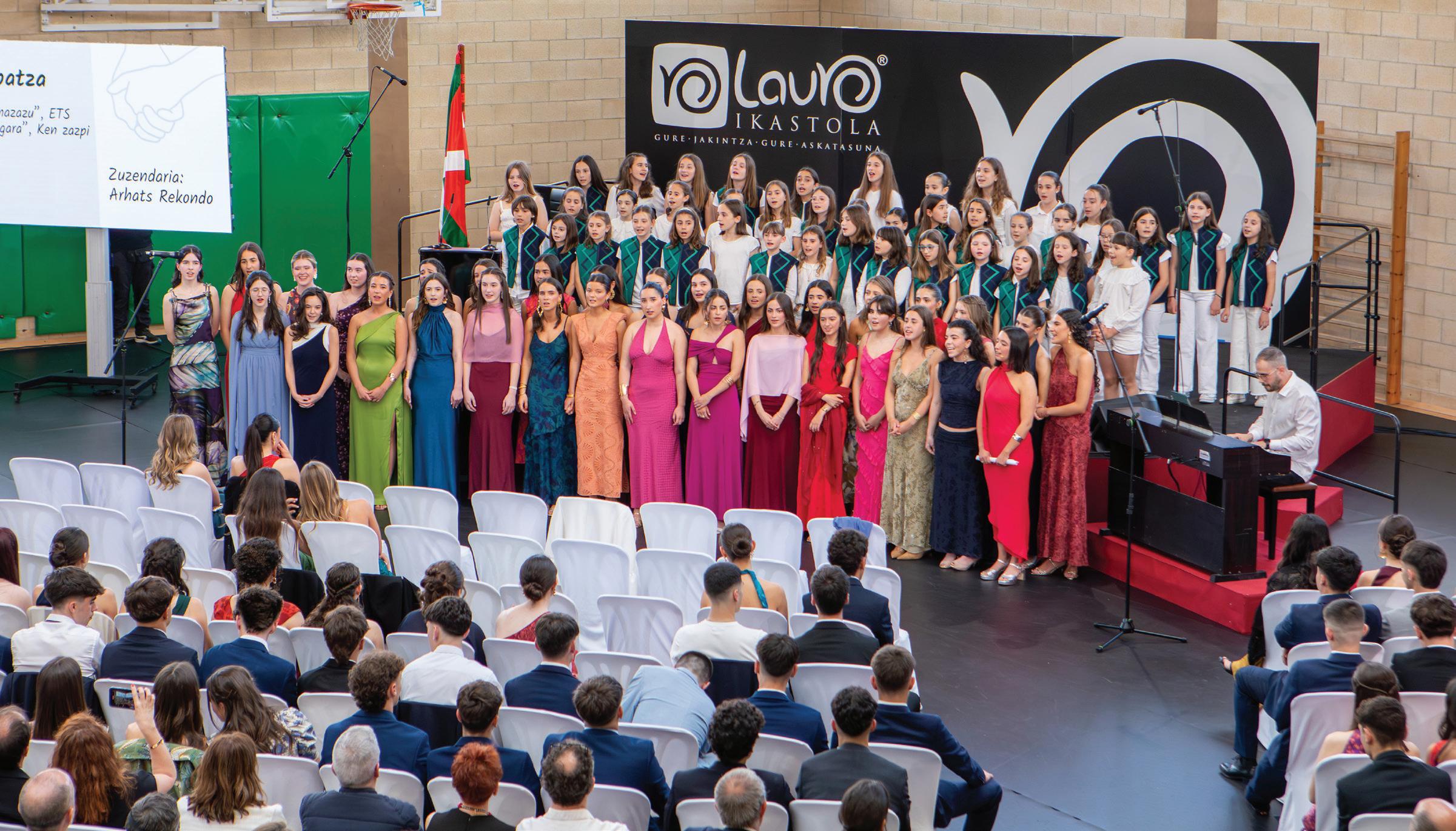 Lehen musika emanaldia Laia Munnék etaAbisai De laVegak egin zuten.Ondoren,Mikel Agirrek, promozioko gurasoen ordezkari gisa, hitz batzuk esan zizkien bertaratutakoei: “ Oso zaila da gaur egun etorkizunari buruz aholkuak ematea, aldaketak inoiz baino arinago doaz eta. Baina ziurtasun gutxi batzuk baditugu: Munduak pertsonak beharko ditu, pertsona prestatuak, zuzen eta zintzoak, eskuzabalak, inguruan gertatzen denagatik kezkatuak (…), beti oinarri sendoarekin. Zuek pertsona horiek zarete, horretarako hezitu nahi izan zaituztegu etxean eta ikastolan, eta horregatik sentitzen gara hain harro zuek guztiak ikusterakoan”.