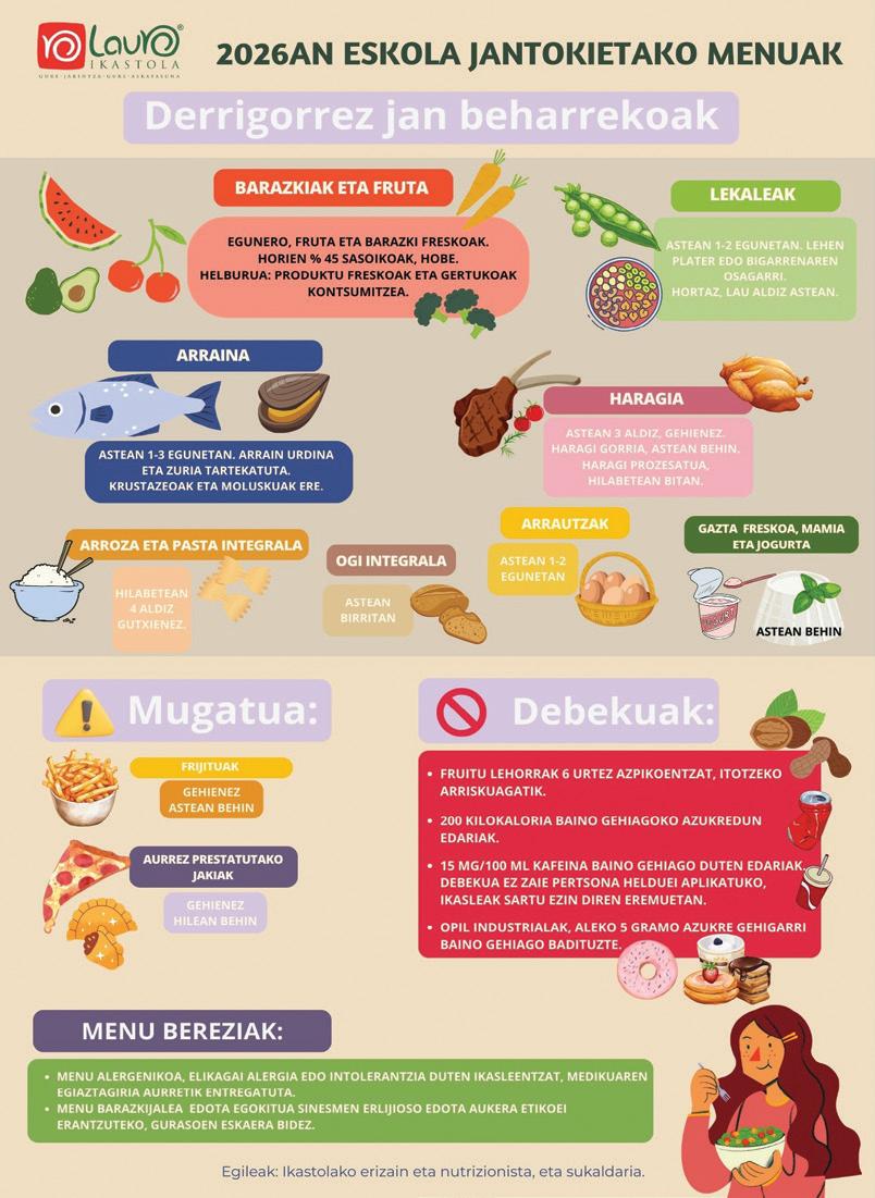 Eskubide Sozial, Kontsumo eta Agenda 2030 Ministerioak sustatuta, 2025eko maiatzean ministro kontseiluak eskola-jantoki Osasungarri eta Jasangarrien Errege Dekretua onartu zuen. Ezarpenari aurrea hartzeko asmoz, Ikastolako sukaldariak eta nutrizionistak baldintza horiek gure menuetan betetzen diren aztertu zuten, adibidez, janari mota bakoitzaren asteko eta hileko maiztasunari dagokionez. Gure menuak eskakizun berriak betetzetik gertu dauden arren, egokitzapen batzuk egingo ditugu, hala nola ogi integrala astean bitan, eta arroza eta pasta integrala, hilean lau aldiz