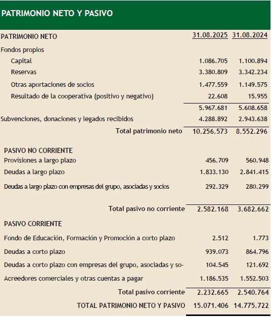 El Patrimonio Neto ha incrementado en 1.704.277 € debido a las subvenciones de Capital del EVE, así como a la aportación de los cooperativistas al Campus, el incremento del Fondo de reserva obligatorio y el beneficio del ejercicio.