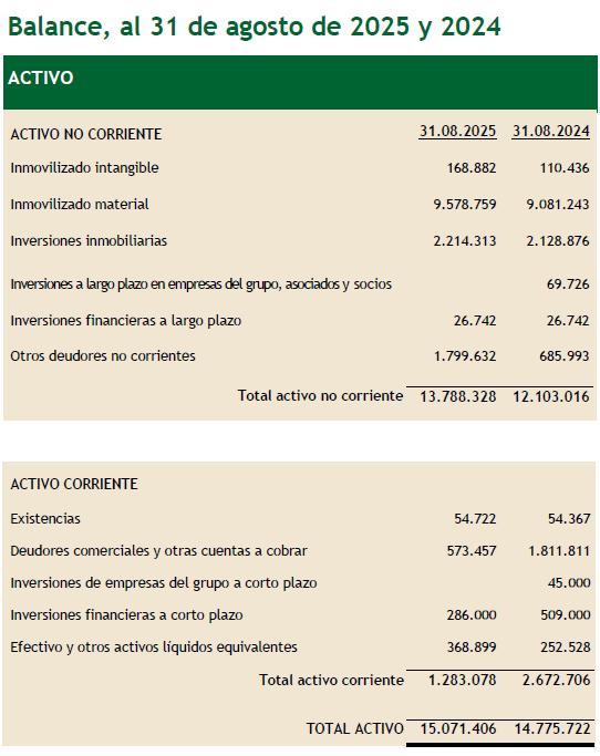 El Activo No Corriente ha incrementado en 1.685.312 € por las inversiones realizadas y por el derecho de cobro de las subvenciones a las inversiones de HEZKOOP 2024. Las inversiones más destacables han sido la mejora de la accesibilidad desde el nuevo aparcamiento, así como la creación de la nueva salida de evacuación del patio del primer ciclo de Primaria, y la ampliación del patio. Se han mejorado las instalaciones de cocina comedor con nuevo montacargas, neveras industriales y espacio específico de elaboración de menús alergénicos, lo que mejora la seguridad y salubridad de los menús. De la misma forma, hemos continuado invirtiendo en la automatización de los sistemas del edificio de Primaria, dotación de switches, cámaras de seguridad y mobiliario para las aulas y tutorías. En las instalaciones deportivas, se ha remodelado el campo de tenis, reconvirtiéndolo en una pista polivalente de baloncesto, tenis, hockey y voleybol. La partida de Inversiones a largo plazo en empresas del grupo ha disminuido debido al deterioro de la participación de la Ikastola en Behekosoloa, por la previsible donación comentada anteriormente.
