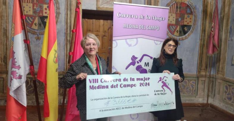 Igualdad, y Mari Juli López, portavoz de la Asociación contra el Cáncer en Medina del Campo, se hizo oficial la entrega de los 3.666 euros recaudados gracias a la participación de 1.222 mujeres inscritas en la carrera. Durante el acto, la concejala destacó el éxito total de la iniciativa, agradeciendo a todas las participantes y a todos los voluntarios que ayudaron a que