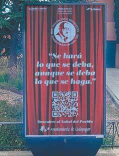 El Ayuntamiento de Galapa gar, la Biblioteca y la ONG Acervo Intergeneracional han iniciado una campaña para dar visibilidad y poner en va lor la figura y la obra de Jacin to Benavente, cuando se cum plen 100 años de la concesión del Premio Nobel. Escapara tes de establecimientos, au tobuses, medallones conme morativos y pantallas digitales exhiben estos días algunos de los aforismos más célebres del autor que vivió y escribió par te de su obra en Galapagar y cuyos restos descansan en el cementerio municipal.