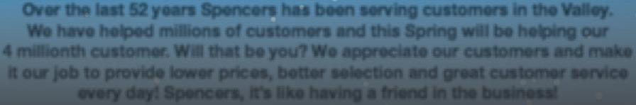 16 | VIERNES29DEMARZODE2024 | LA VOZ ARIZONA LAVAPLATOSREFRIGERADOR • Ciclo de lavado • Secadora al calor On/O • Repisa superior estándar • 2 repisas ajustables • Compartimento de galón en puerta • Cajón de vegetales frescos • Diseño de lujo sin ruido • Full HD 1080p • 2 HDMI 32LF500 $329 32 TV $199 $449 HPS15BTHLCC ATAQUE! SECADORA CONGELADOR 25.3 PS. CÚB. REFRIGERADOR • Capacidad 6.5 Ps.Cúb. •11 ciclos de secado • Opción para prevenir arrugas • 3 ajustes de temperatura • Control de secado automático • Bandejas de vidrio a prueba de derrames • Cajón control humedad • Almacenaje de puerta galón • Filtro de agua $359 $989 $1499 $379 YNED4600YQ LIQUIDACIÓN YNED4600YQ LIQUIDACIÓN LIQUIDACIÓN NTW4500XQ $1099 - 10% de descuento LAVAPLATOS Precision Direct™ Sistema de lavado FBD2400LW LIBRE DE ESCARCHA REFRIGERADOR estantes de vidrio deslizable FFTR1814LW LIQUIDACIÓN LAVADORA • Capacidad 3.4 ps. cub • 9 ciclos de lavar •Canasta de porcelana •Velocidad de giro 700RPM Los4 Por Sólo ¡Los representantes independiente más grande de Arizona! NOW OPEN - MESA 5141 S. Power Rd. 480-988-1917 SCOTTSDALE 14202 N. Scottsdale Rd. 480-991-7200 GOODYEAR 1707 N. Litchfield Rd 623-930-0770 ARROWHEAD RANCH 7346 W. Bell Rd. 623-487-7700 GILBERT Santan Village 2711 S. Santan Village Pkwy 480-366-3900 SCOTTSDALE/PHOENIX 13820 N.Tatum Blvd. (602) 494-0100 MESA 115 W. First Ave. 480-833-3072 AHWATUKEE 4601 E. Ray Rd. 480-777-7103 WWW.SPENCERSTV.COM ABIERTO L-V 9AM-8PM • SÁBADO 9AM-6PM • DOMINGO 11AM-4PM ¡Donde consigue ofertas de FFFC05MIQW SÓLO • Canasta desmontable • Control ajustable • Drenaje para agua descongelada • Espacio 5 Ps.Cúb. $179 MIRCOONDA MONTABLE Autococinar Sensor de palomitas MWV150KW ESTUFA 30” ELECTRICA SUPERFICIE SUAVE Ventana extra grande Relo y alarma en la puerta FCRC3012AW la Se HDA2000TWW LIQUIDACIÓN *See store for details. ** NO INTEREST IF PAID IN FULL BY JANUARY 1, 2025. $599.00 Minimum Purchase Required Minimum Payments Required 2.99% APR If the promotional balance is not paid in full by the end for the promotional period or, to the extent permitted by law, if you make a late payment, interest will be imposed from the date of purchase at the APR noted above. This APR is as of 2/26/22 and will vary with the market based on the Prime Rate. Your card agreement, the terms of the offer and applicable law govern this transaction including increasing APRs and fees and terminating the promotional period 12 MONTHS NO INTEREST** T Over the last 52 years Spencers has been serving customers in the Valley. We have helped millions of customers and this Spring will be helping our 4 millionth customer. Will that be you? We appreciate our customers and make it our job to provide lower prices, better selection and great customer service every day! Spencers, it’s like having a friend in the business! Samsung Refrigerator Beautyrest Mattress PRIZE Samsung 85”TV PRIZE PRIZE Value $8,000 to $10,000 FIRST PRIZE KITCHEN CUSTOMER Will You Be The Sale! Depending On Selection.