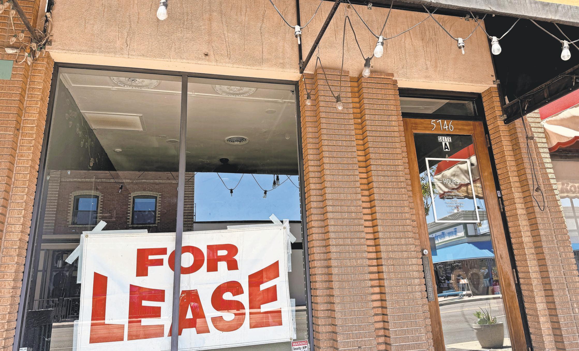 Una pizzería de larga trayectoria está abierta y algunos clientes disfrutan de sus porciones. Sin embargo, está junto a un local vacío con un gran cartel de "Se alquila" en el escaparate.
