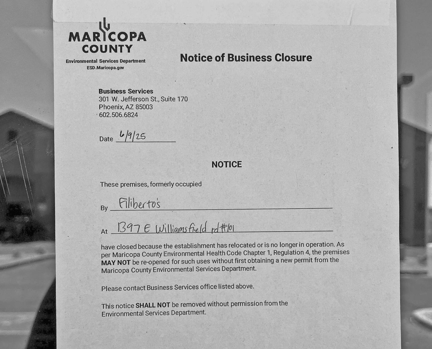 Aviso del Condado de Maricopa indicando que Filiberto's, ubicado en 1397 E. Williams Field Road, ha cerrado permanentemente. Publicado el 10 de junio de 2025. SHELBY SLADE/THE REPUBLIC