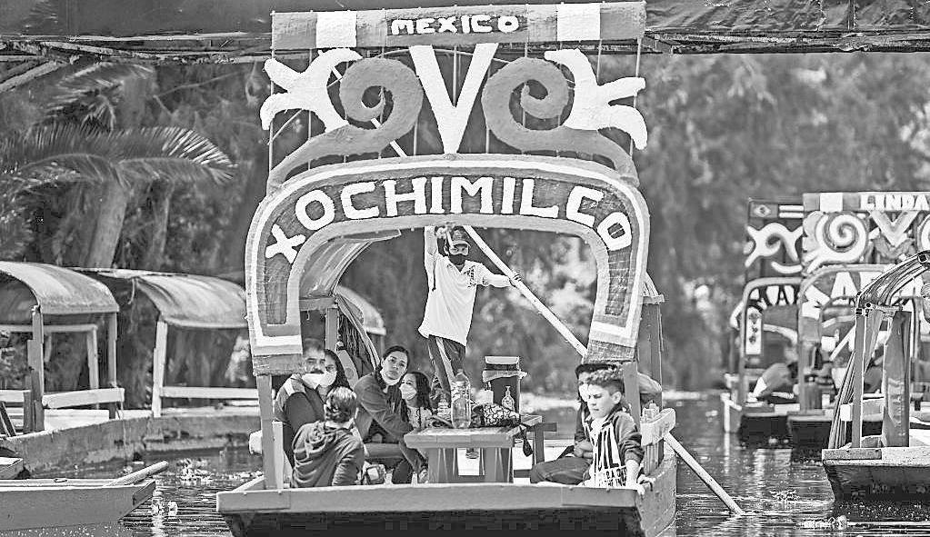 Una familia es vista en una "trajinera" en el muelle del canal Nativitas en Xochimilco, una red de canales y jardines flotantes que es una de las principales atracciones turísticas de la Ciudad de México. AFP VIA GETTY IMAGES