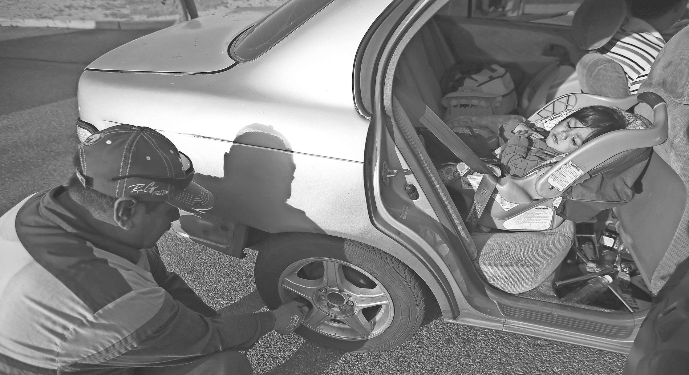 Normando Moreno, de Community Tire Pros and Auto Repair, revisa un neumático mientras Jaden Rosales, de 1 año, espera un nuevo asiento gratis durante un evento de Safe Kids Coalition en 2015. CHERYL EVANS/THE REPUBLIC