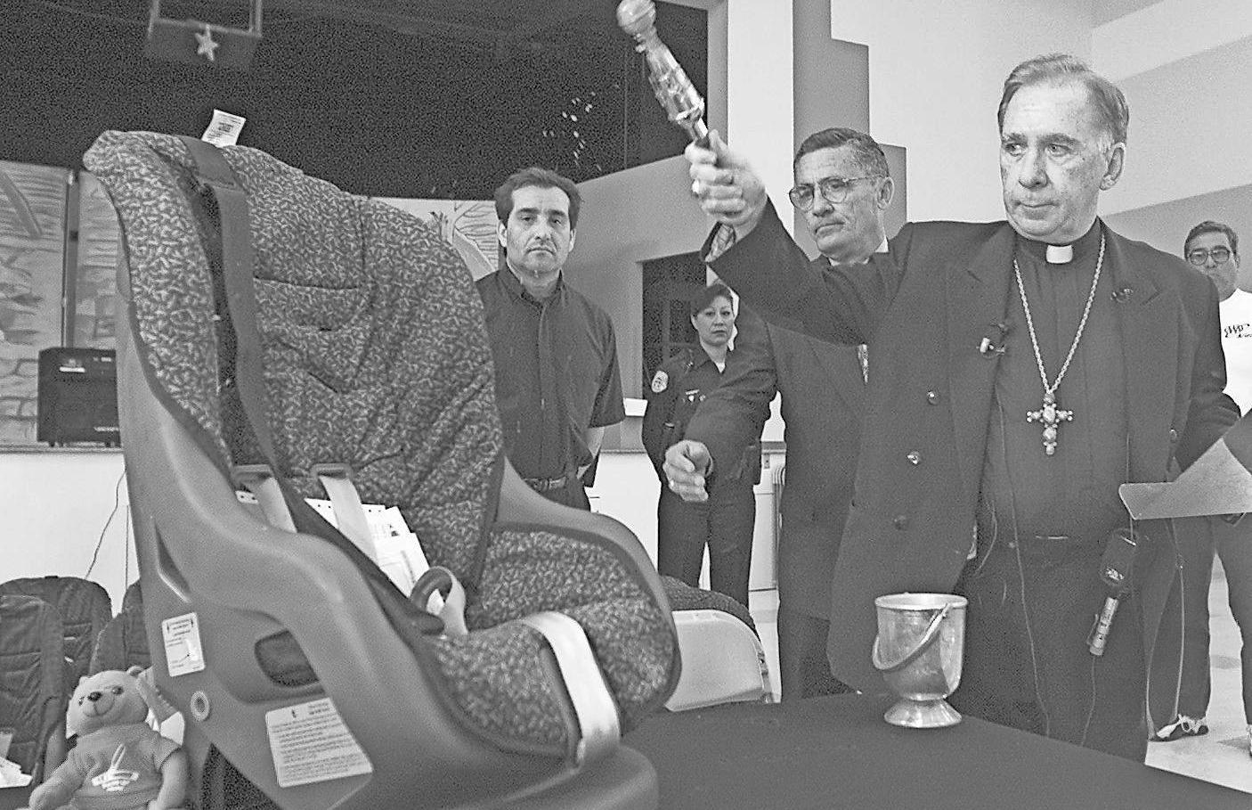 El ex obispo Thomas O'Brien bendice un asiento de automóvil alentando a los miembros de la comunidad hispana a usar asientos de automóvil y cinturones de seguridad con sus hijos. TOM TINGLE/THE REPUBLIC