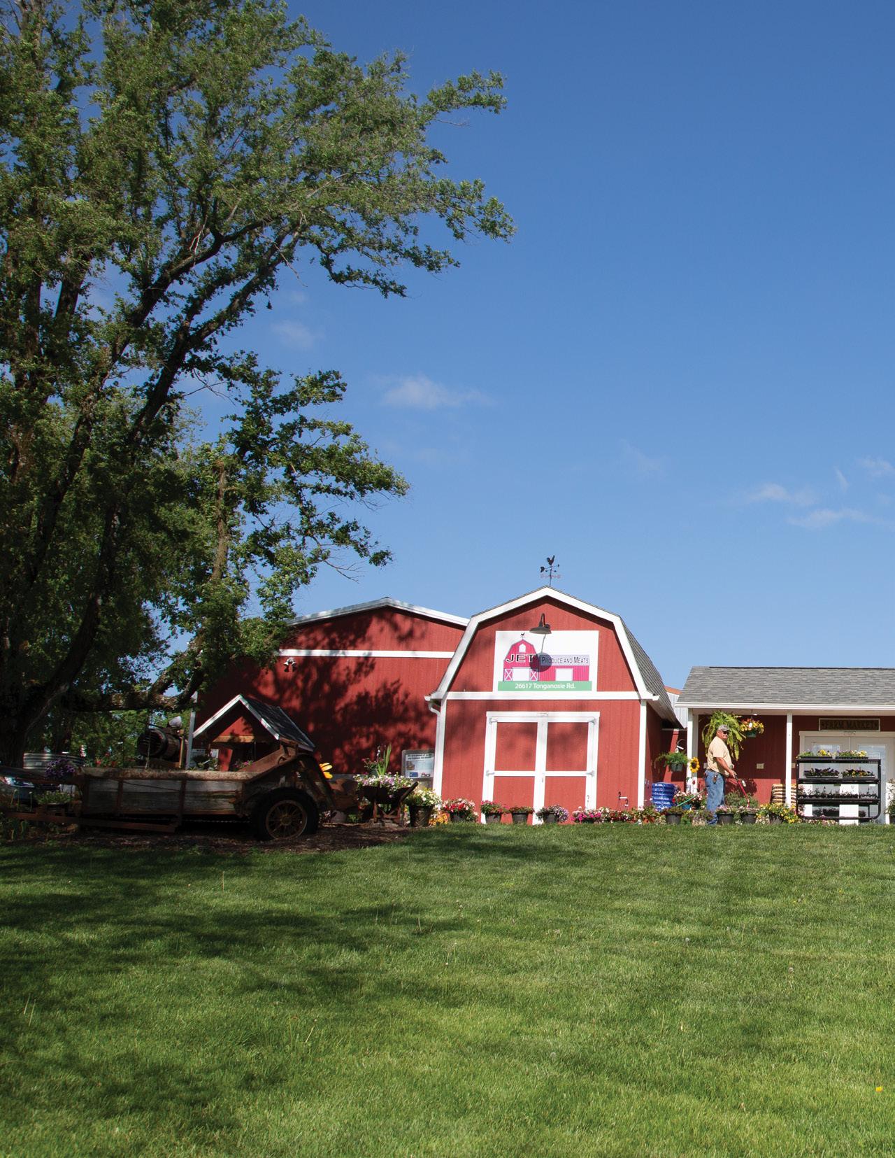 The Lawrence community is surrounded by myriad farms that produce the fresh foods that pop up not only at the farmers market but also on the plates in local restaurants.Karen Pendleton displaying basil plants in the green house. Right: Customers surround the Pendleton Country Market at the Lawrence Farmers’ Market