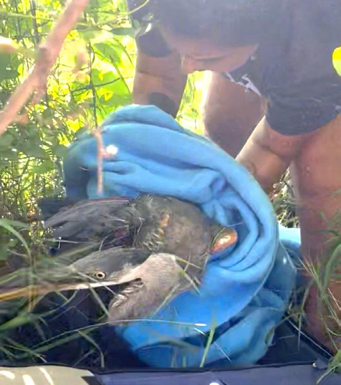 Lawrence Humane staff wrap the heron in a towel to safely transport to Operation Wildlife