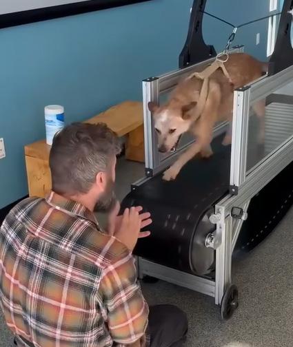 MJ cheers on a shelter pup running on a slatmill! A slatmill is a non-motorized treadmill with wooden slats for traction. It’s a great way to help pups burn off lots of energy!