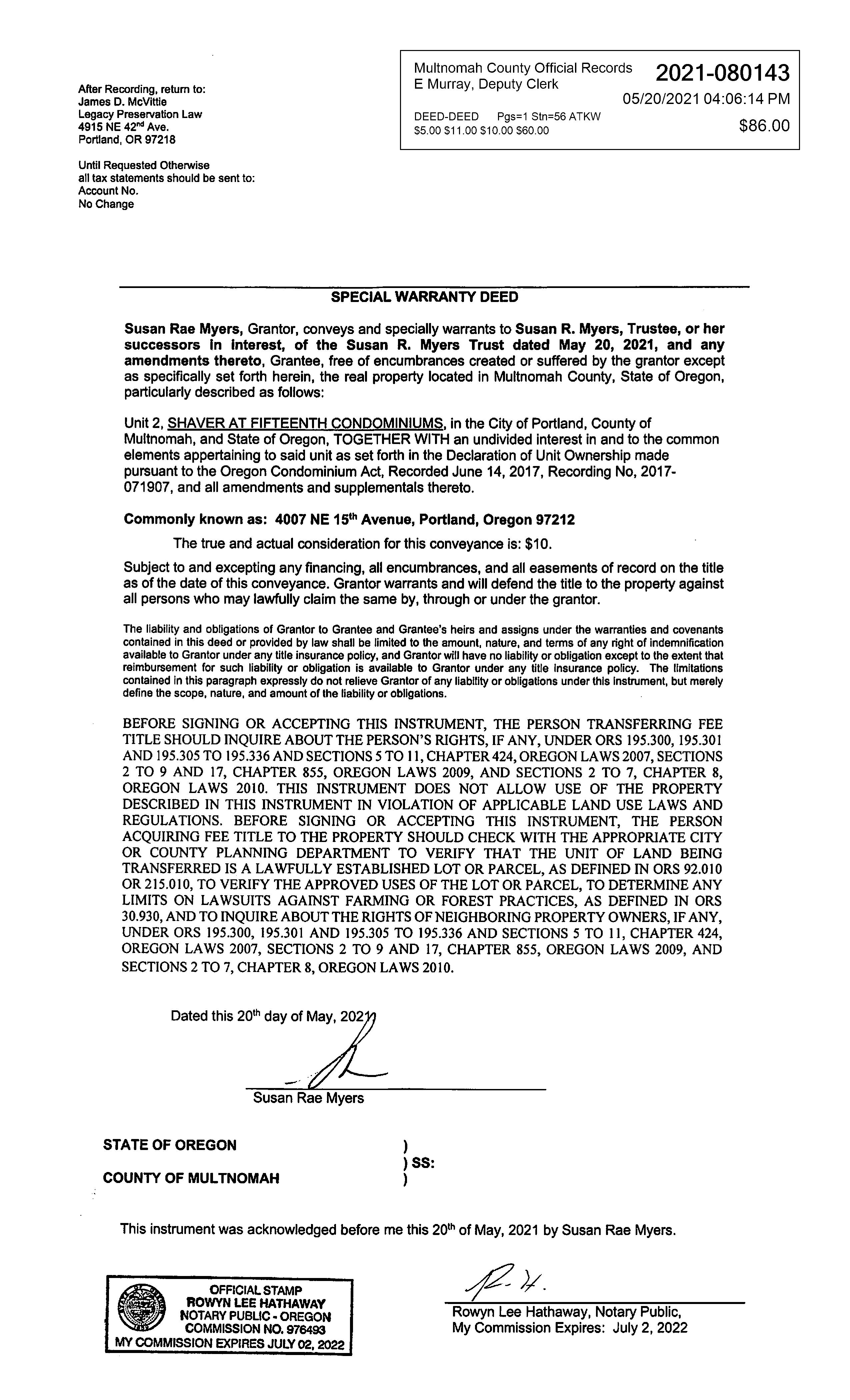 Owner:Susan,RMyersTrust 4007NE15thAve
