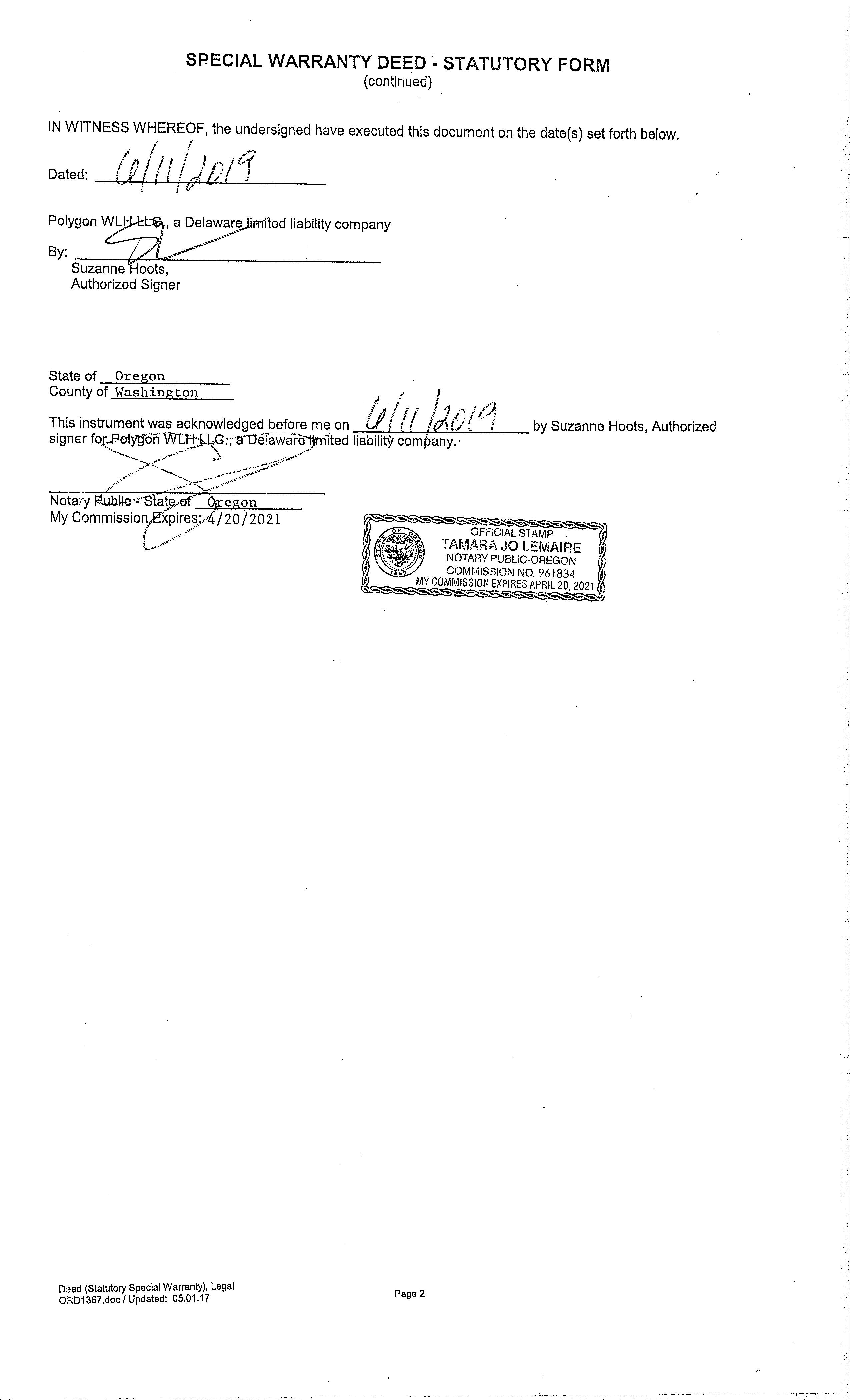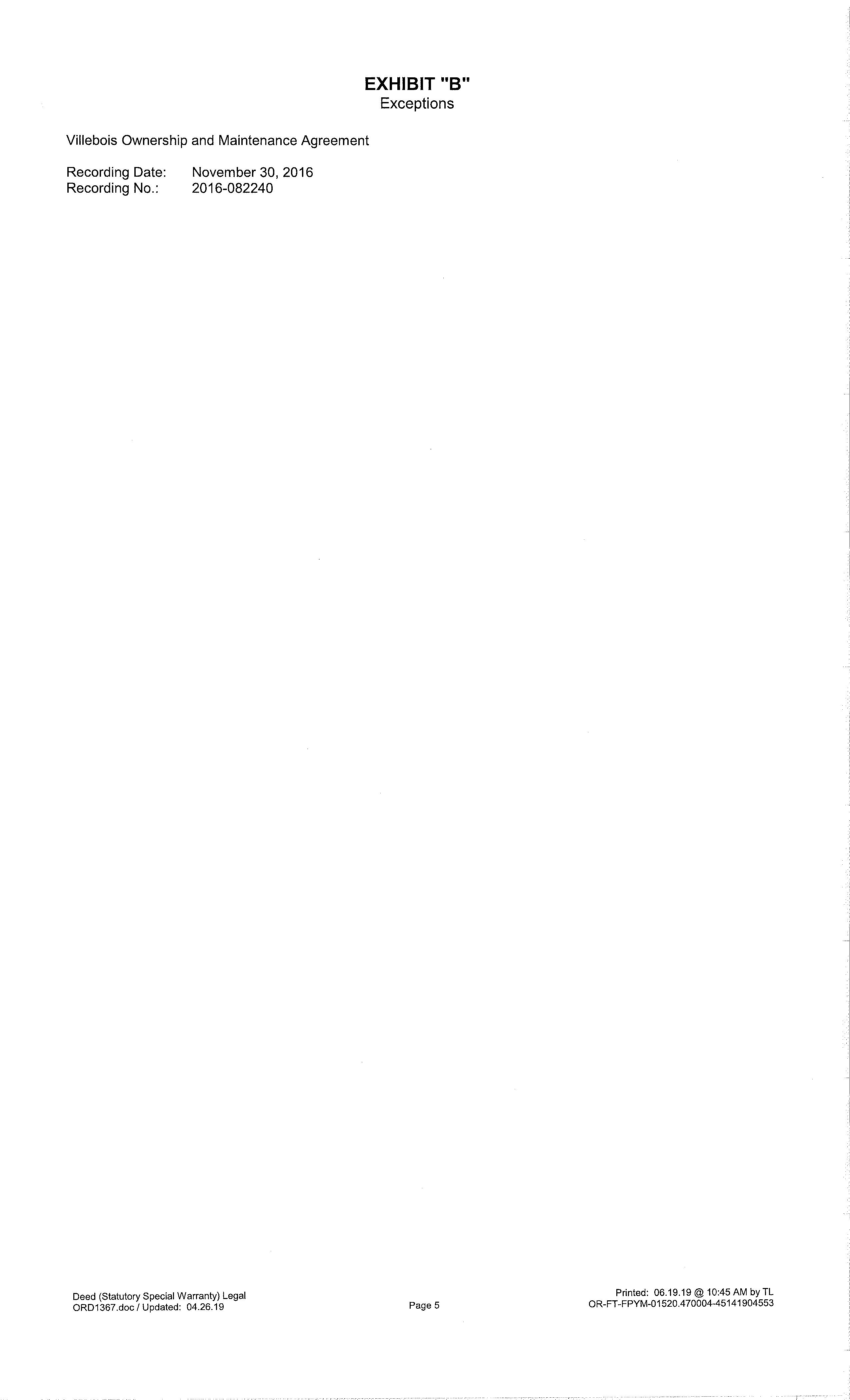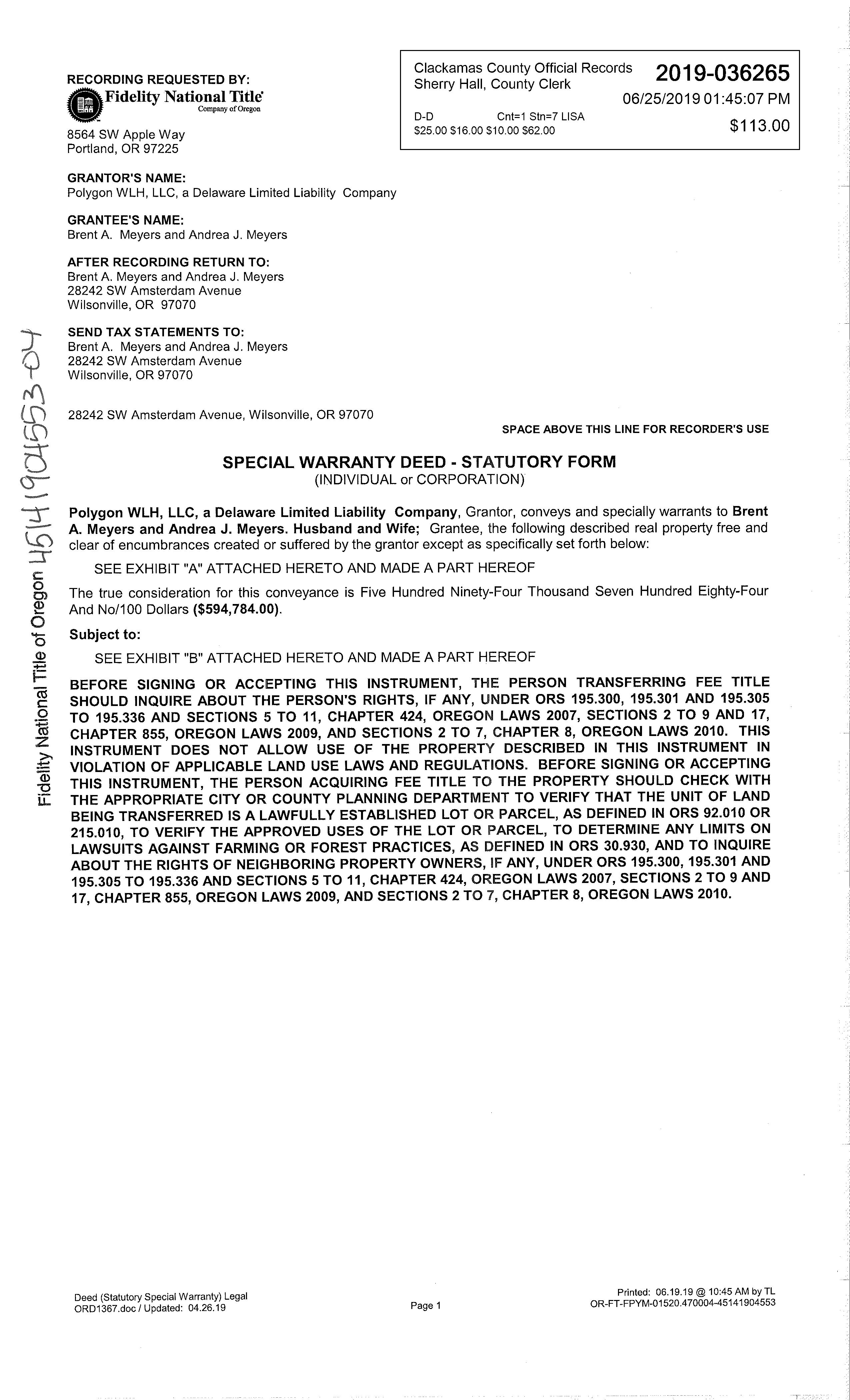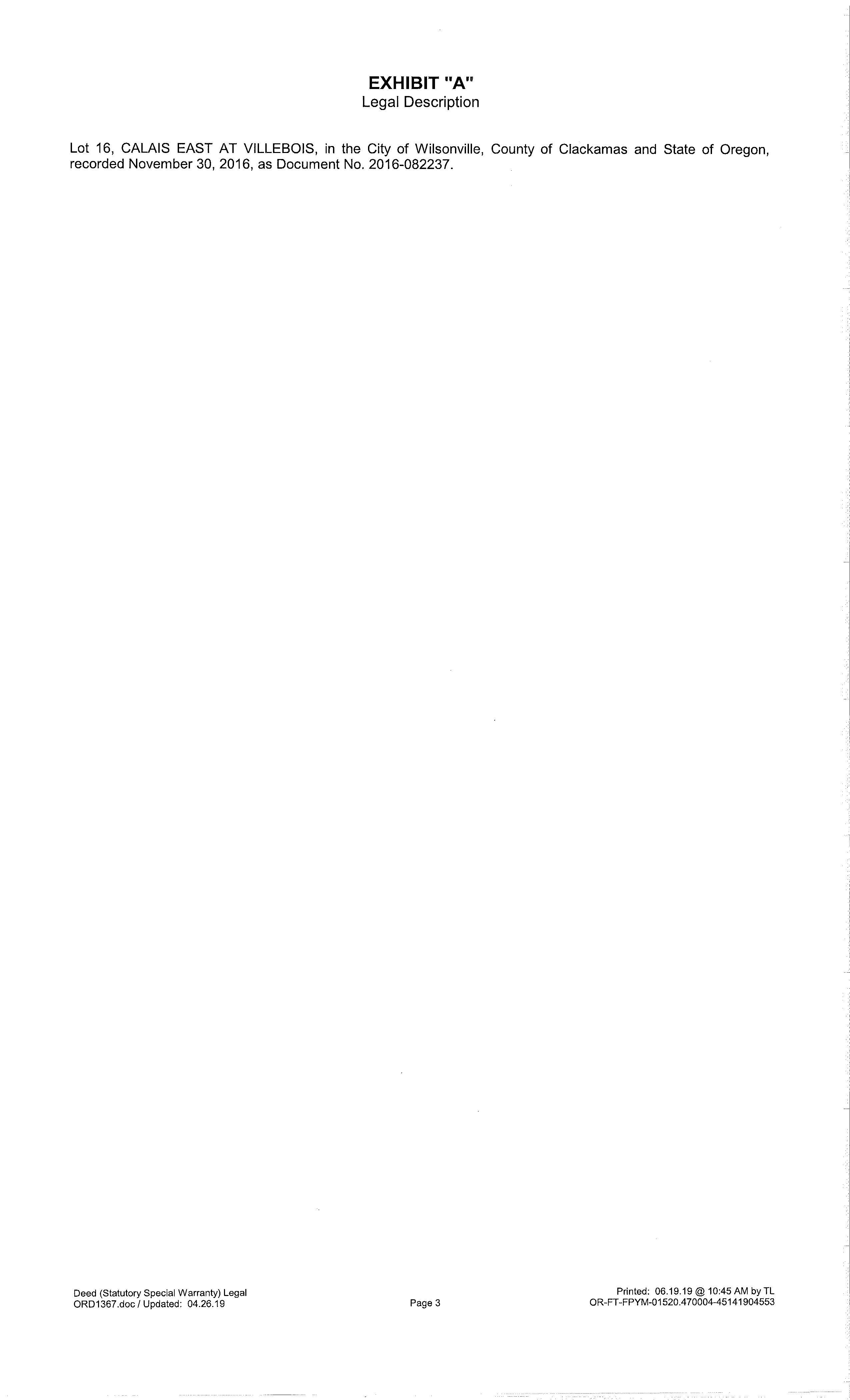 06/25/2019 06/27/2019 17:09:00 Recording Processed Property Transfer Filing No.: 355046, Special Warranty Deed, Recording No.: 2019-036265 06/25/2019 by HALLEYWUN