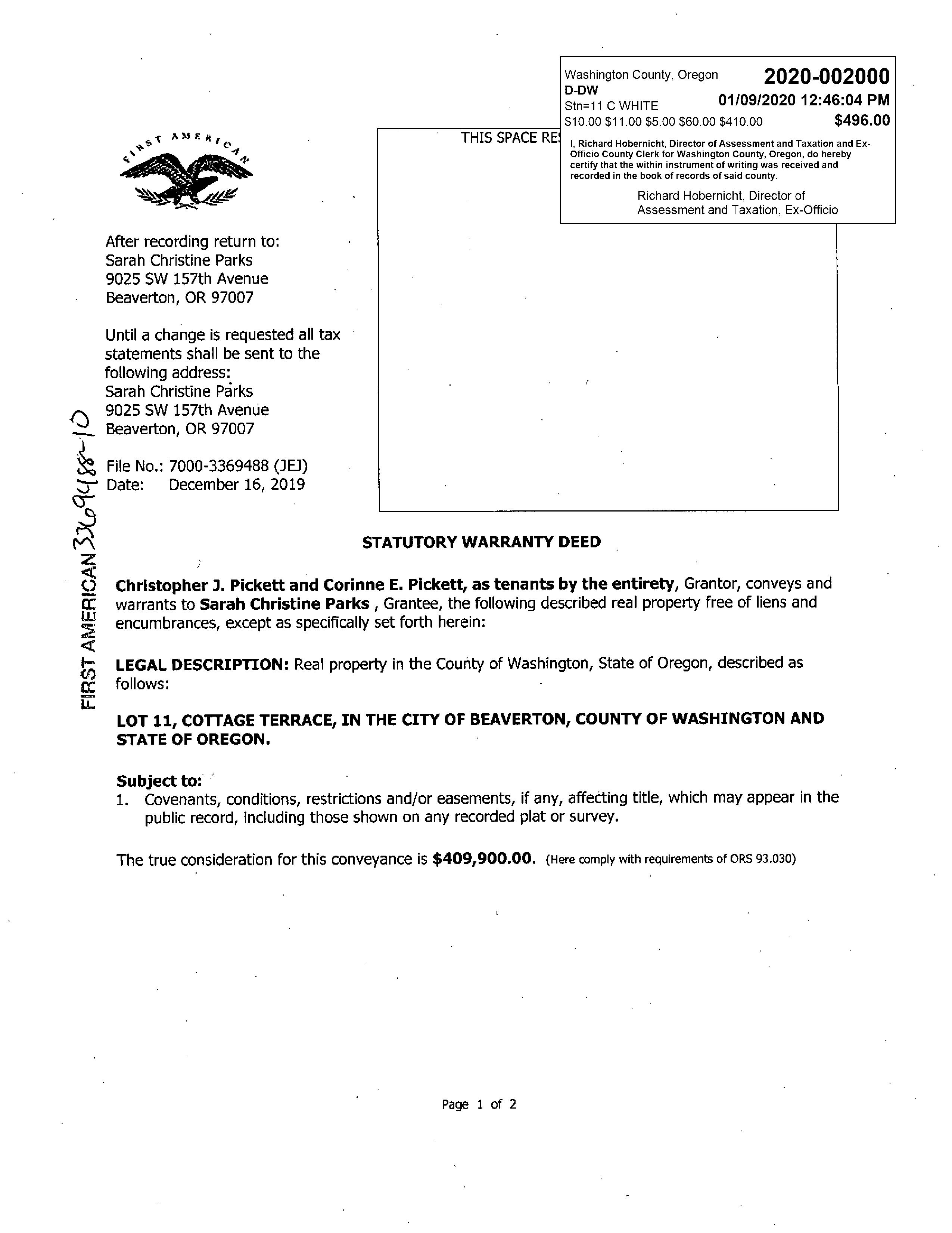 Owner Name PARKS, SARAH CHRISTINE Mailing Address 9025 SW 157TH AVE BEAVERTON, OR 97007