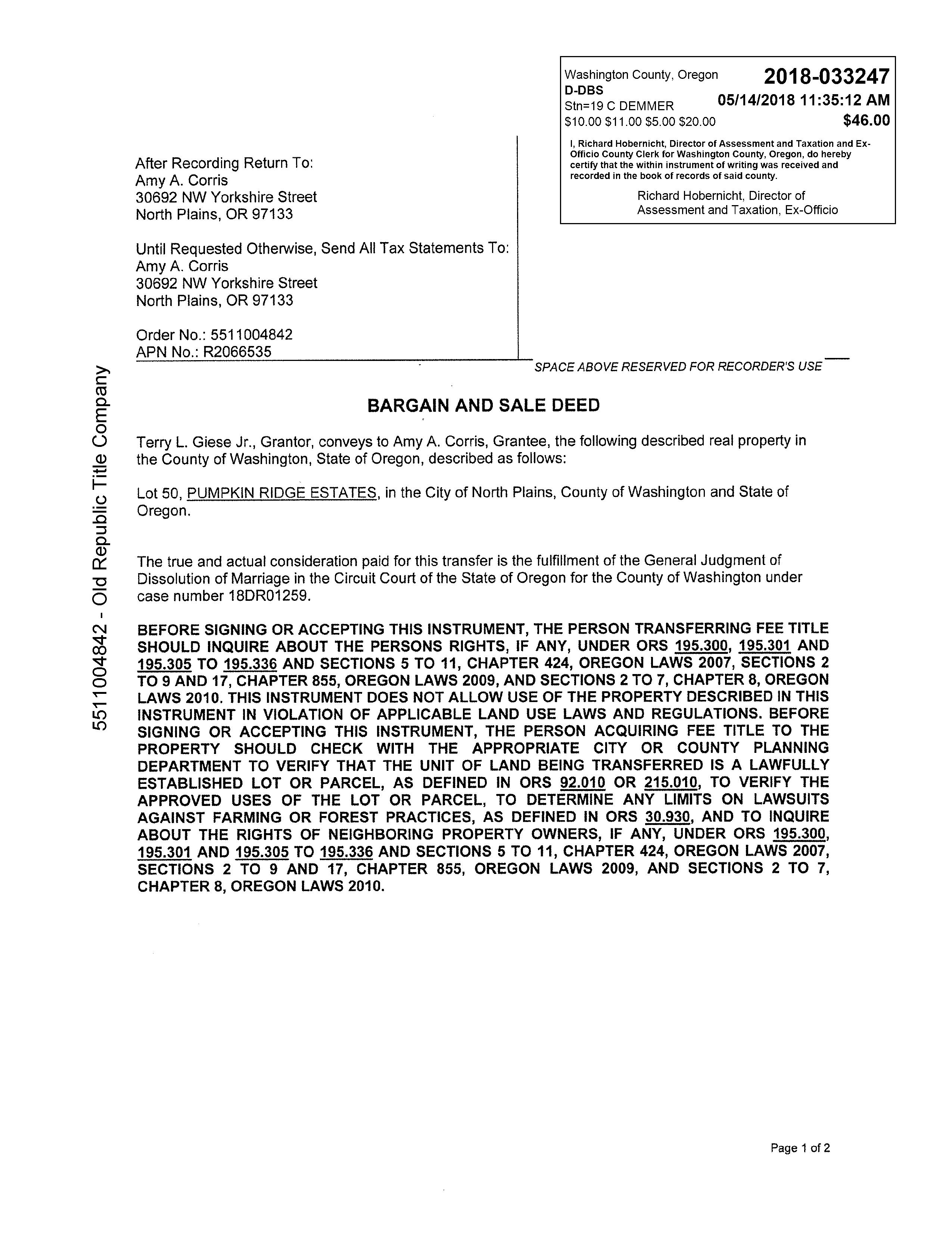 Subject Property Location Report Date: 01/27/2023 Property Address 30692 NW YORKSHIRE ST Order ID: R105532951 City, State & Zip NORTH PLAINS, OR 97133-8124 County WASHINGTON COUNTY Property Use Single Family Residential Mailing Address 30692 NW YORKSHIRE ST, NORTH PLAINS, OR 97133-8124 Parcel Number 1N301AD-05000 Subject Property Address 30692 NW YORKSHIRE ST, NORTH PLAINS, OR 97133 APN 1N301AD-05000 Owner CORRIS, AMY A Lot Size (SF/AC) 8,712/.2 Bedrooms 3 Year Built 1998 Living Area (SF) 1,900 Bathrooms/Partial 3 Garage/No. of Cars Garage/2 Phones Nearby Neighbor #1 Address 30720 NW YORKSHIRE ST, NORTH PLAINS, OR 97133 APN 1N301AD-04900 Owner CRAWFORD, CHARLES T & SWANSON, SHARON M Lot Size (SF/AC) 8,276/.19 Bedrooms 4 Year Built 1997 Living Area (SF) 2,553 Bathrooms/Partial 3 Garage/No. of Cars Garage/2 Phones Nearby Neighbor #2 Address 30660 NW YORKSHIRE ST, NORTH PLAINS, OR 97133 APN 1N301AD-05100 Owner ESCHILLING, SHERI & ESCHILLING, JULIE M Lot Size (SF/AC) 9,148/.21 Bedrooms 3 Year Built 1940 Living Area (SF) 1,246 Bathrooms/Partial 1 Garage/No. of Cars Phones Nearby Neighbor #3 Address 30657 NW TUREL DR, NORTH PLAINS, OR 97133 APN 1N301AD-03300 Owner COX, JUSTIN A Lot Size (SF/AC) 7,841/.18 Bedrooms 4 Year Built 1997 Living Area (SF) 2,336 Bathrooms/Partial 3 Garage/No. of Cars Garage/2 Phones (503) 466-0589 Nearby Neighbor #4 Address 30767 NW TUREL DR, NORTH PLAINS, OR 97133 APN 1N301AD-03500 Owner KAPOOR, MANPRIT S Lot Size (SF/AC) 7,841/.18 Bedrooms 4 Year Built 1997 Living Area (SF) 2,050 Bathrooms/Partial 3 Garage/No. of Cars Garage/2 Phones Nearby Neighbor #5 Address 30639 NW TUREL DR, NORTH PLAINS, OR 97133 APN 1N301AD-03200 Owner BRADY, BRETT A & BRADY, ELYSSA C Lot Size (SF/AC) 7,841/.18 Bedrooms 3 Year Built 1997 Living Area (SF) 1,796 Bathrooms/Partial 2 Garage/No. of Cars Garage/2 Phones (704) 778-1132 Nearby Neighbor #6 Address 30783 NW TUREL DR, NORTH PLAINS, OR 97133 APN 1N301AD-03600 Owner ROBBINS, TYLER A & ROBBINS, MEGAN A Lot Size (SF/AC) 7,405/.17 Bedrooms 4 Year Built 1997 Living Area (SF) 2,026 Bathrooms/Partial 3 Garage/No. of Cars Garage/2 Phones