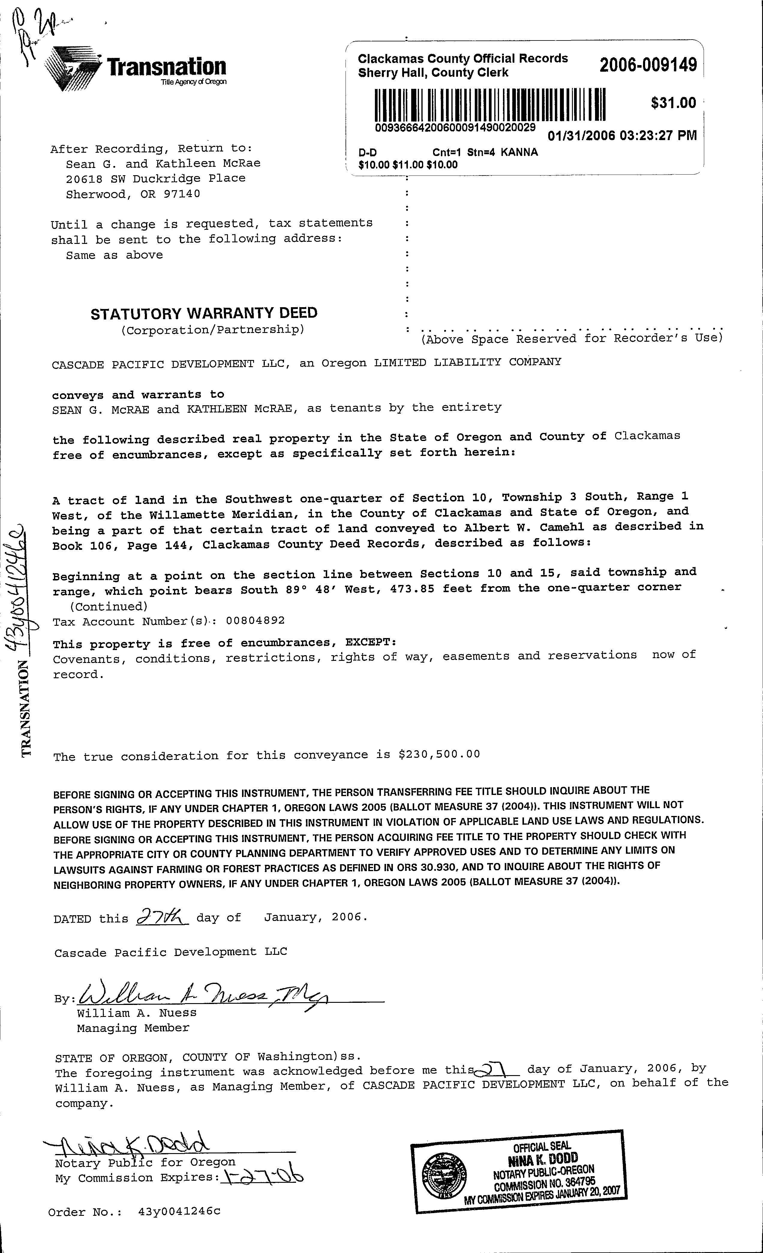 SaleDate EntryDate Recording Date Recording Number Sale Amount Excise Number Deed Type Transfer Type Grantor(Seller) Grantee(Buyer) Other Parcels 01/27/2006 02/09/2006 01/31/2006 2006009149 $230,500.00 135253 S CASCADE PACIFIC DEVELOPMENT LLC MCRAE SEAN G & KATHLEEN No 03/12/2005 03/18/2005 03/14/2005 2005022168 $97,500.00 114672 S EVANS RICHARD K & PAMELA J CASCADE PACIFIC DEVELOPMENT LLC No PropertyDetails LivingAreaSqFt ManfStructSize YearBuilt ImprovementGrade Stories Bedrooms FullBaths HalfBaths 3179 0 X 0 2006 58 2.0 4 2 1 No