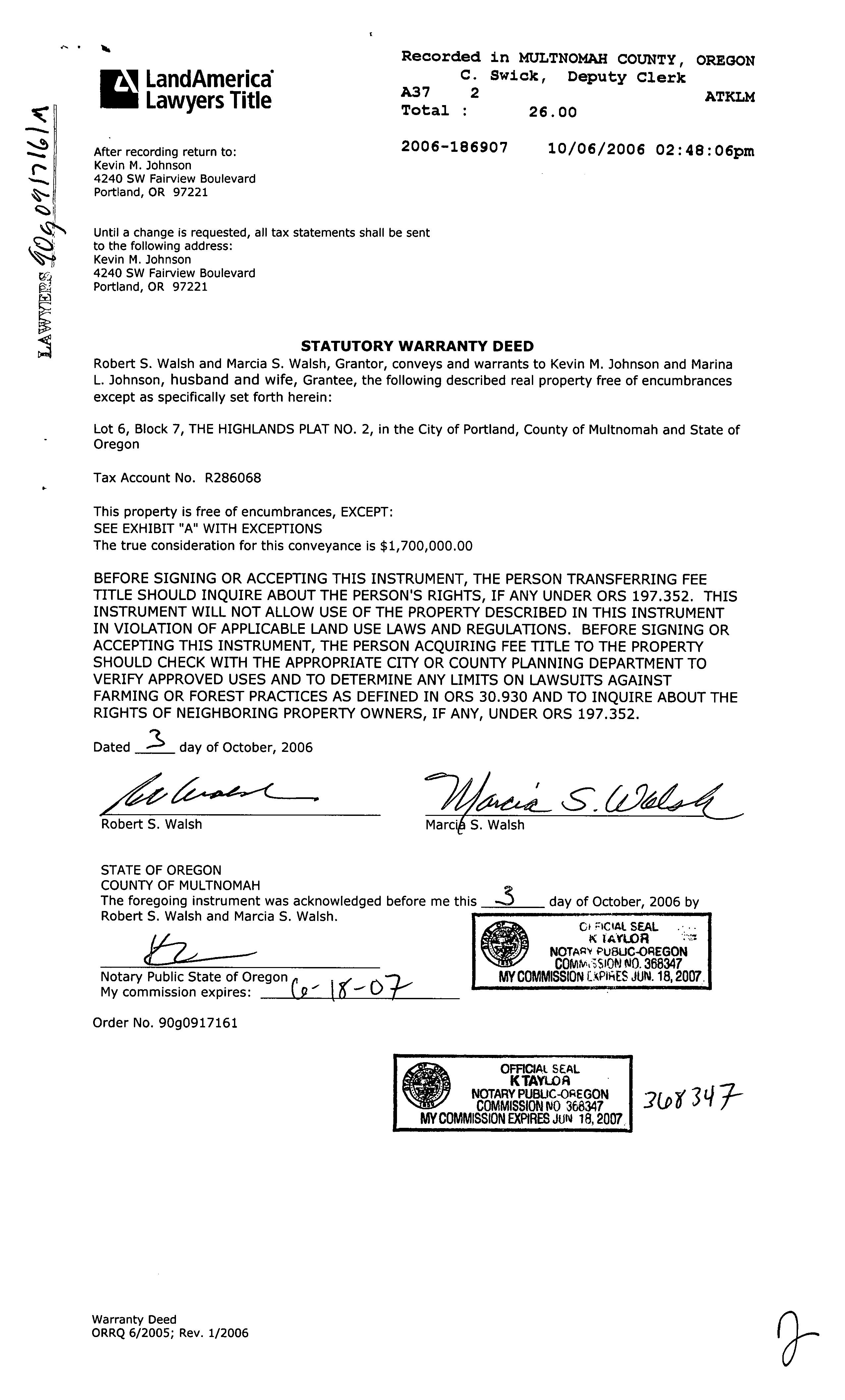 Linked PropertiesProperty Group IDGrouped PropertiesSplit / Merge DateSplit / Merge AccountsSplit / Merge MessageIMPROVEMENTS ? Expand/Collapse All LANDSEGMENTS LANDNO LANDTYPE LANDSIZE L1 RESRESIDENTIALLAND 26,000Sq.ft TOTALS 26,000Sq.ft/0.60acres ASSESSEDVALUES YEAR IMPROVEMENTS LAND SPECIALMARKET/USE RMV M5VALUE EXEMPTIONS M50ASSESSED 2022 $1,740,090 $625,530 - / - $2,365,620 $2,365,620 $1,179,840 2021 $1,729,910 $565,680 - / - $2,295,590 $2,295,590 $1,145,480 2020 $1,694,420 $535,830 - / - $2,230,250 $2,230,250 $1,112,120 2019 $1,676,760 $545,830 - / - $2,222,590 $2,222,590 $1,079,730 2018 $1,611,830 $545,830 - / - $2,157,660 $2,157,660 $1,048,290 2017 $1,476,680 $505,900 $0 / $0 $1,982,580 $1,982,580 $1,017,760 2016 $1,230,660 $466,000 - / $0 $1,696,660 $1,696,660 $988,120 2015 $1,125,390 $478,650 - / $0 $1,604,040 $1,604,040 $959,340 2014 $1,125,390 $478,650 $0 / $0 $1,604,040 $1,604,040 $931,400 2013 $958,890 $461,300 $0 / $0 $1,420,190 $1,420,190 $904,280 SALESHISTORY DEED SELLER BUYER INSTR# DATE CONSIDERATION AMOUNT WD WALSH,ROBERTS&MARCIAS JOHNSON,KEVINM&JOHNSON,MARINA L 2006186907 10/3/2006 $1,700,000 WD PORTLANDWELLSFARGOASSOCIATES LTD PORTLANDWELLSFARGOASSOCIATES LTD BP19252081 8/1/1986 $190,245 ? Improvement #1 Improvement Type Building Type Class - SINGLEFAMILYRESIDENTIAL 2ORMORESTYW/ATTIC&BSMT 6P