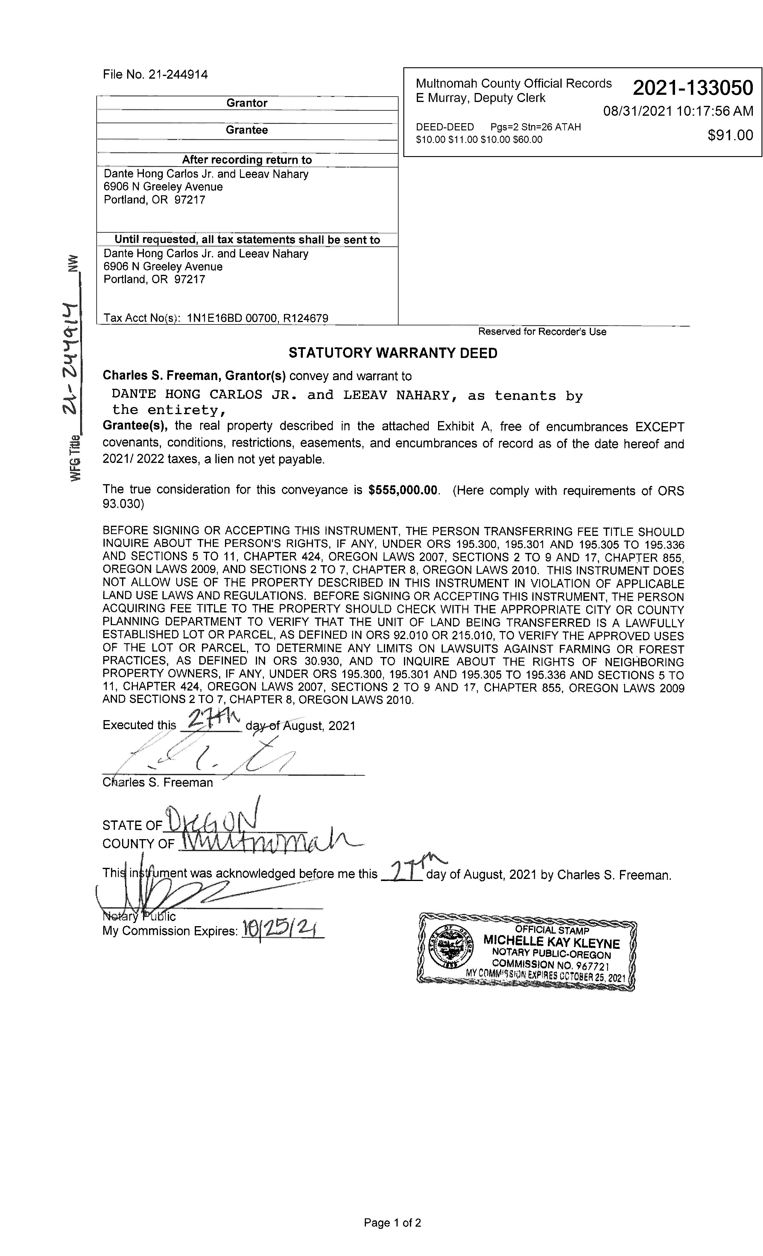 SEGMENTS LANDNO LANDTYPE LANDSIZE L1 RESRESIDENTIALLAND 5,000Sq.ft TOTALS 5,000Sq.ft/0.11acres ASSESSEDVALUES YEAR IMPROVEMENTS LAND SPECIALMARKET/USE RMV M5VALUE EXEMPTIONS M50ASSESSED 2022 $236,120 $291,000 - / - $527,120 $527,120 $151,700 2021 $218,610 $271,000 - / - $489,610 $489,610 $147,290 2020 $187,070 $231,000 - / - $418,070 $418,070 $143,000 2019 $190,580 $226,000 - / - $416,580 $416,580 $138,840 2018 $190,580 $226,000 - / - $416,580 $416,580 $134,800 2017 $187,070 $206,000 $0 / $0 $393,070 $393,070 $130,880 2016 $173,070 $186,000 - / $0 $359,070 $359,070 $127,070 2015 $167,460 $136,400 - / $0 $303,860 $303,860 $123,370 2014 $145,740 $123,000 $0 / $0 $268,740 $268,740 $119,780 2013 $130,760 $109,000 $0 / $0 $239,760 $239,760 $116,300 SALESHISTORY DEED SELLER BUYER INSTR# DATE CONSIDERATION AMOUNT WD FREEMAN,CHARLESS CARLOS,DANTEHONGJR &NAHARY,LEEAV 2021133050 8/27/2021 $555,000 WD TOMLINSON,STEPHENETAL FREEMAN,CHARLESS 00090418 6/28/2000 $117,400 HEIR HAGSTROM,CARLENECESTOF TOMLINSON,STEPHENETAL 00090418 6/29/2000DECR HAGSTROM,LAWRENCEJA& CARLENE HAGSTROM,CARLENEC 00090421 6/29/2000WD BLACK,BRUCEWETAL HAGSTROM,LAWRENCEJA&CARLENE 94034970 3/1/1994 $61,000 WD LINDGREN,CHERILYNL BLACK,EDWINJETAL BP27813995 11/1/1993 $49,000 ? Improvement #1 Improvement Type Building Type Class - SINGLEFAMILYRESIDENTIAL 1STYW/BSMT 3.0