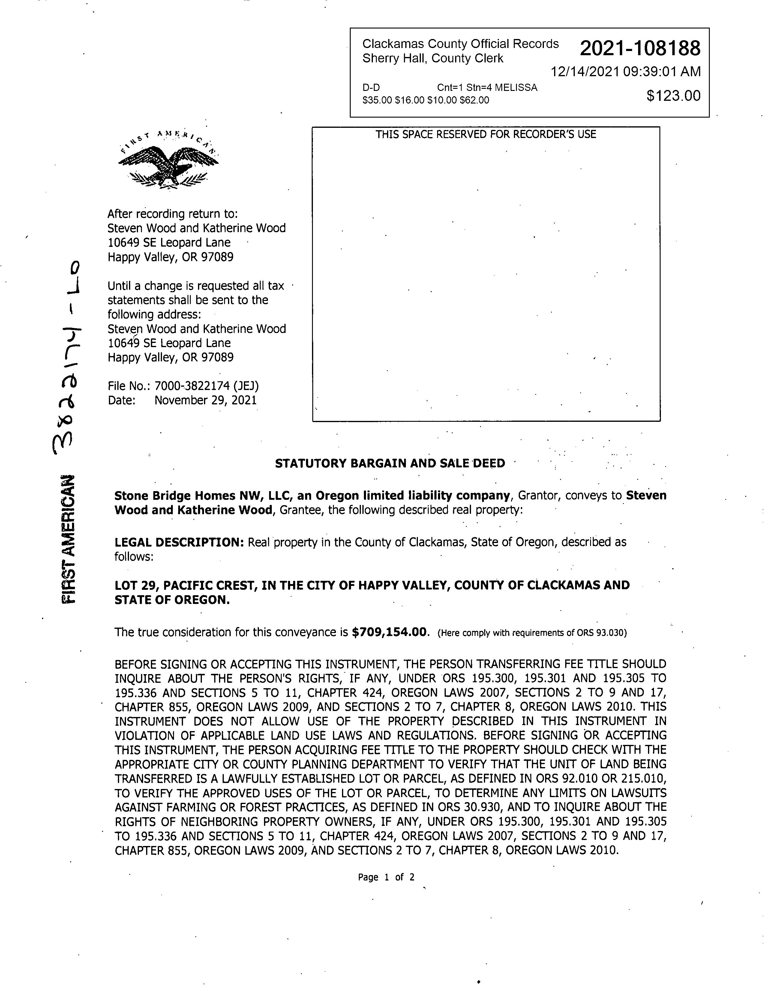 GeneralInformation AlternateProperty# 13E31AB03500 PropertyDescription SubdivisionPACIFICCREST4649LT29 LastSalePrice $709,15400 LastSaleDate 01/24/2022 LastSaleExciseNumber 406433 PropertyCategory Land&/orBuildings Status Active,LocallyAssessed TaxCodeArea 012-273 Remarks TaxRate Description Rate Total Rate 19.4997 PropertyCharacteristics Neighborhood 11061: Happy Valley newer subdivisions 100, 101 Land Class Category 101: Residential land improved Building Class Category 14: Single family res, class 4 Year Built 2021 Change property ratio 1XX Parties Role Percent Name Address Taxpayer 100 WOOD STEVEN 10649 SE LEOPARD LN, DAMASCUS, OR 97089 Tax Service Co 100 LERETA MORTGAGE CO MAILING, UNKNOWN, Owner 100 WOOD STEVEN 10649 SE LEOPARD LN, DAMASCUS, OR 97089 Owner 100 WOOD KATHERINE 10649 SE LEOPARD LN, DAMASCUS, OR 97089 Mortgage Company 100 NEW AMERICAN FUNDING NO MAILING ADDRESS, AVAILABLE, PropertyValues ValueType TaxYear 2023 TaxYear 2022 TaxYear 2021 TaxYear 2020 TaxYear 2019 AVR Total $396,917 $385,357 Exempt TVR Total $396,917 $385,357 Real Mkt Land $235,904 $224,444 Real Mkt Bldg $523,070 $504,020 Real Mkt Total $758,974 $728,464 M5 Mkt Land $235,904 $224,444 M5 Mkt Bldg $523,070 $504,020 M5 SAV SAVL (MAV Use Portion) MAV (Market Portion) $396,917 $385,357 Mkt Exception $728,464 AV Exception $385,357 Parents ParcelNo. Seg/MergeNo. Status FromDate ToDate Continued DocumentNumber AccountNumber 05037677 PropertyAddress 10649 SE LEOPARD LN , DAMASCUS, OR 97089