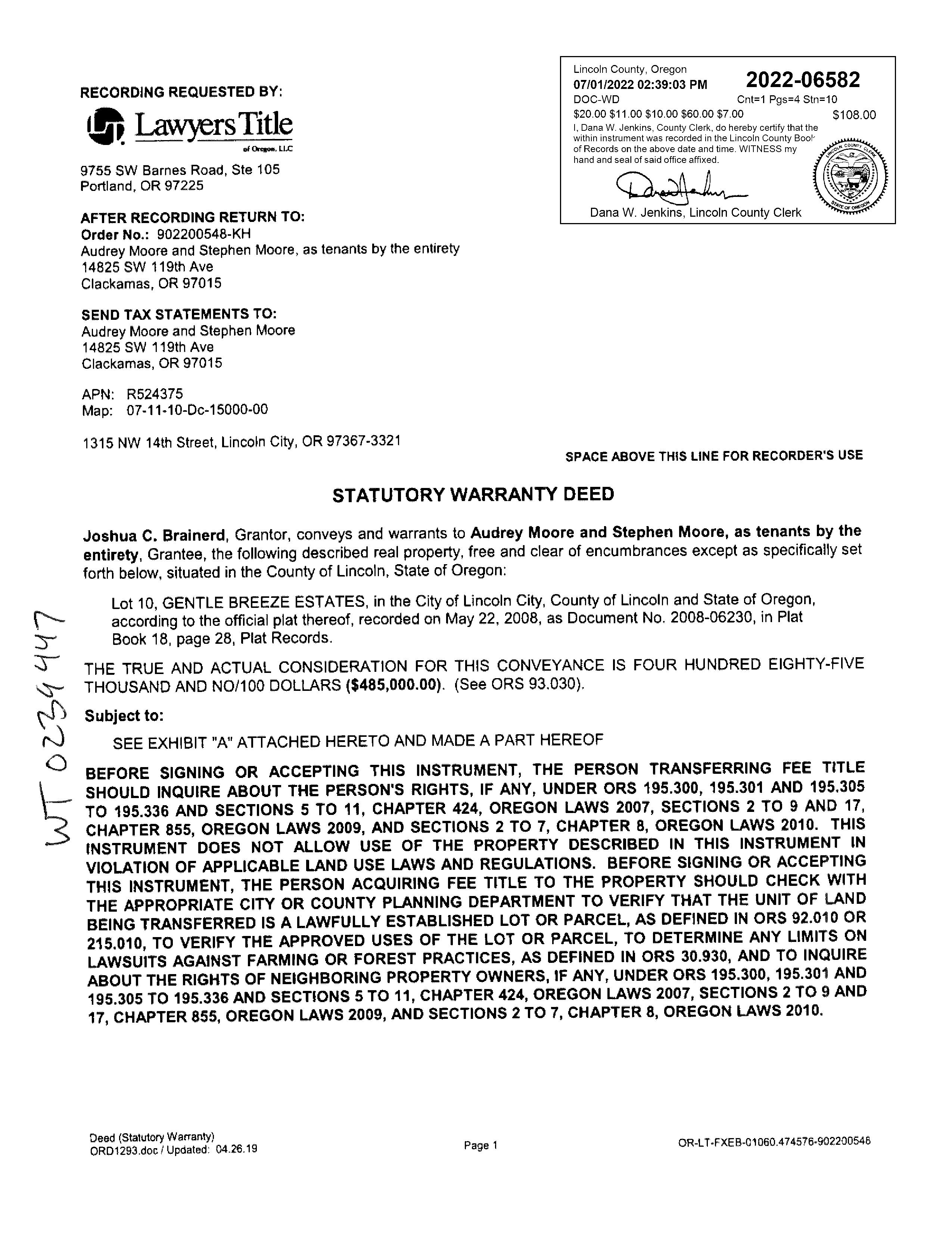 1315 NW 114th St Lincoln City, OR 97367 Audrey Moore Opt 525 3rd St., Suite 200 Lake Oswego, OR 97034