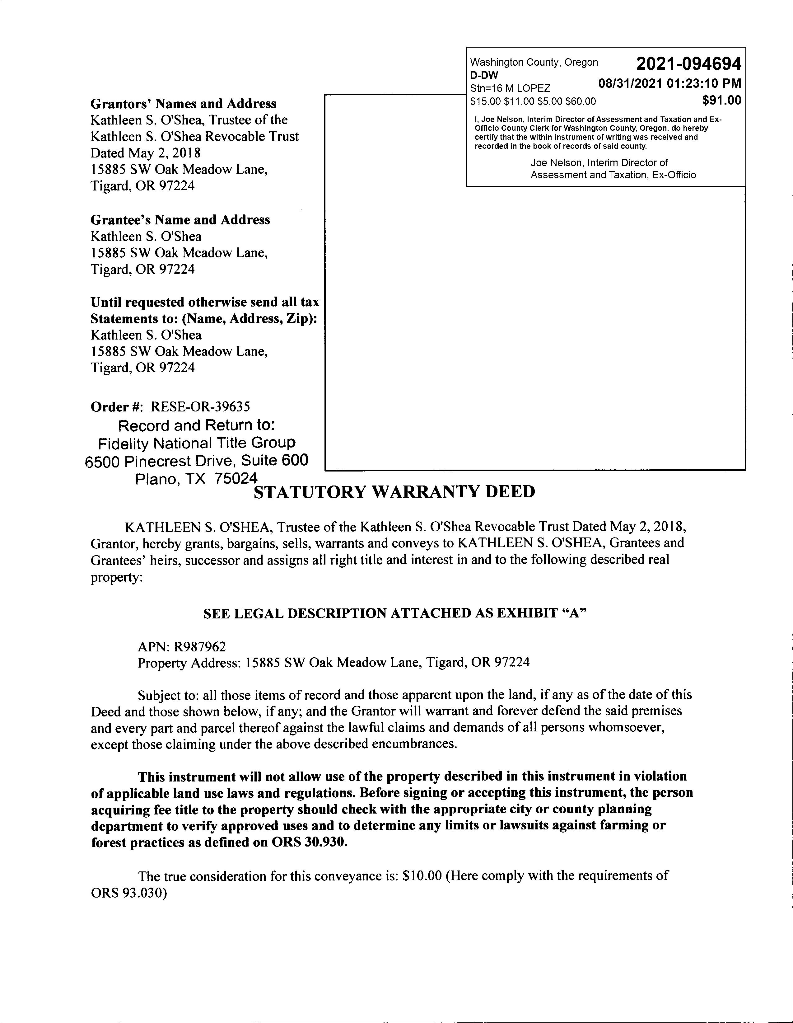 R987962 O'SHEA, KATHLEEN S 15885 SW OAK MEADOW LN, TIGARD, OR 97224