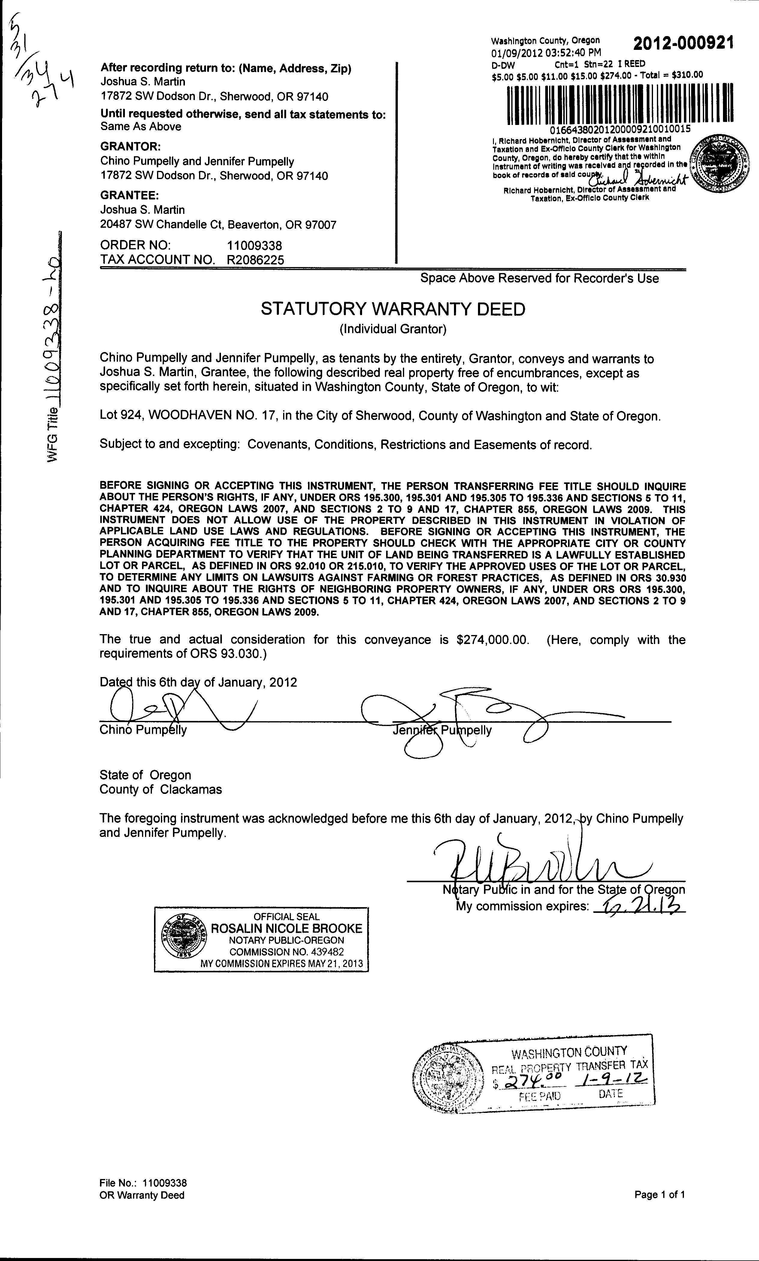 Eéective Date: Property Property Address 2022 Real Market Value R2086225 17872SWDODSONDR,SHERWOOD,OR97140 $609,190 2023GENERALINFORMATION Property Status AActive Property Type Residential Legal Description WOODHAVENNO.17,LOT924,ACRES 0.12 Alternate Account NumberNeighborhood WDHVWOODHAVEN Map Number 2S131CD12100 Property Use 1010:RESIDENTIALIMPROVED LevyCodeArea 088.10 2022CertiêedTaxRate 18.1890 RELATEDPROPERTIES Linked PropertiesProperty Group IDGrouped PropertiesSplit / Merge DateSplit / Merge AccountsSplit / Merge Message2022IMPROVEMENTS ? Expand/Collapse All 2022LANDSEGMENTS STATECODE SEGMENTTYPE LANDSIZE L1 01:SGLFAMIMPHS 0.12acres TOTALS 0.12acres CERTIFIED/INPROCESSVALUES YEAR IMPROVEMENTS LAND RMV SPECIALUSE ASSESSEDVALUE 2022 $361,610 $247,580 $609,190 $0 $271,290 2021 $268,770 $236,360 $505,130 $0 $263,390 SALESHISTORY SALEDATE SELLER BUYER INST# SALEPRICE INSTTYPE 1/6/2012 Unknown Unknown 2012000921 $274,000 DW 5/21/2002 Unknown Unknown 2002060397 $198,900 DW 5/11/2000 Unknown Unknown 2001046098 $55,000 DW 5/1/2000 Unknown Unknown 2000038414 $553,000 CM