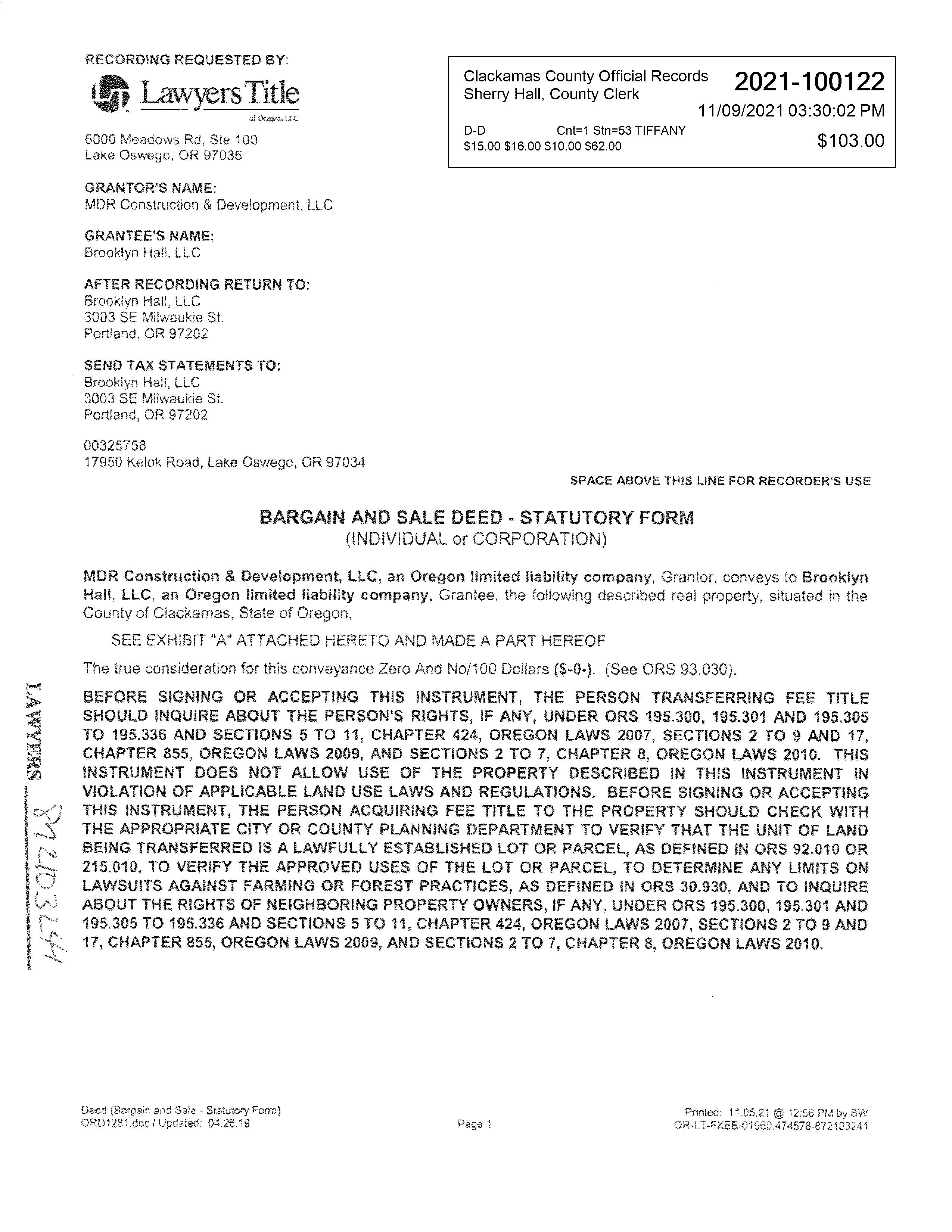 GeneralInformation AlternateProperty# 21E17CA00300 PropertyDescription Section17Township2SRange1EQuarterCATAXLOT00300 LastSalePrice $000 LastSaleDate 12/07/2021 LastSaleExciseNumber 403655 PropertyCategory Land&/orBuildings Status Active,LocallyAssessed TaxCodeArea 007-021 Remarks TaxRate Description Rate Total Rate 19.237 PropertyCharacteristics Neighborhood 14471: Lake Grove newer 100, 101 Land Class Category 101: Residential land improved Building Class Category 13: Single family res, class 3 Year Built 1961 Acreage 0.53 Change property ratio 1XX Parties Role Percent Name Address Taxpayer 100 BROOKLYN HALL LLC 3003 SE MILWAUKIE AVE, PORTLAND, OR 97202 Owner 100 BROOKLYN HALL LLC 3003 SE MILWAUKIE AVE, PORTLAND, OR 97202 PropertyValues ValueType TaxYear 2022 TaxYear 2021 TaxYear 2020 TaxYear 2019 TaxYear 2018 AVR Total $333,763 $324,042 $314,604 $305,441 $296,545 Exempt TVR Total $333,763 $324,042 $314,604 $305,441 $296,545 Real Mkt Land $405,875 $341,170 $310,583 $304,701 $290,583 Real Mkt Bldg $161,890 $135,910 $125,160 $122,760 $123,140 Real Mkt Total $567,765 $477,080 $435,743 $427,461 $413,723 M5 Mkt Land $405,875 $341,170 $310,583 $304,701 $290,583 M5 Mkt Bldg $161,890 $135,910 $125,160 $122,760 $123,140 M5 SAV SAVL (MAV Use Portion) MAV (Market Portion) $333,763 $324,042 $314,604 $305,441 $296,545 Mkt Exception AV Exception Parents ParcelNo. Seg/MergeNo. Status FromDate ToDate Continued DocumentNumber No Parents Found AccountNumber 00325758 PropertyAddress 17950 KELOK RD , LAKE OSWEGO, OR 97034