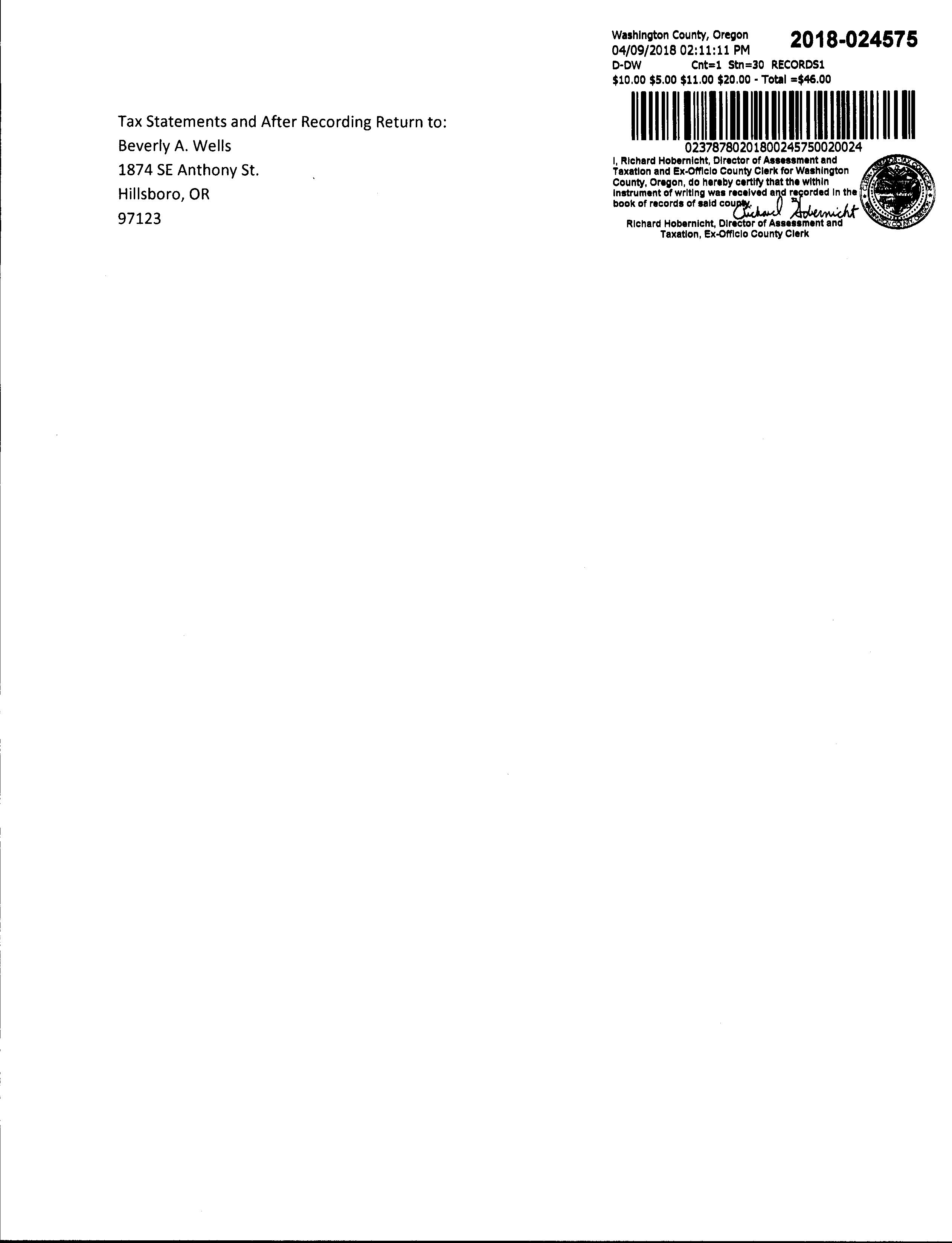 Property Owner PropertyAddress 2022Real R1116107 WELLS,RANDALLRENSLEAR&BEVERLYANNEREVLIVTRUST 1874SEANTHONYST,HILLSBORO,OR97123 $525,300 2023GENERALINFORMATION PropertyStatus AActive PropertyType Residential LegalDescription ANTHONYPARK,LOT14,ACRES0.23 AlternateAccountNumberNeighborhood SWHBSOUTHWESTHILLSBORO MapNumber 1S208CA04000 PropertyUse 1010:RESIDENTIALIMPROVED LevyCodeArea 007.01 2022CertifiedTaxRate 16.8822 2023OWNERINFORMATION OwnerName WELLS,RANDALLRENSLEAR&BEVERLYANNE REVLIVTRUST MailingAddress 1874SEANTHONYSTHILLSBORO,OR97123 RELATEDPROPERTIES LinkedPropertiesPropertyGroupIDGroupedPropertiesSplit/MergeDateSplit/MergeAccountsSplit/MergeMessage2022IMPROVEMENTS ? Expand/CollapseAll 2022LANDSEGMENTS STATECODE SEGMENTTYPE LANDSIZE L1 01:SGLFAMIMPHS 0.23acres TOTALS 0.23acres CERTIFIED/INPROCESSVALUES YEAR IMPROVEMENTS LAND RMV SPECIALUSE ASSESSEDVALUE 2022 $296,460 $228,840 $525,300 $0 $258,320 2021 $228,320 $218,960 $447,280 $0 $250,800 SALESHISTORY SALEDATE SELLER BUYER INST# SALE PRICE INST TYPE WELLS,RANDALLR&WELLS, BEVERLYA WELLS,RANDALLRENSLEAR&BEVERLYANNEREVLIV TRUST 2018024575 - DW 6/12/2017 FERREN,SHARONM WELLS,RANDALLR&WELLS,BEVERLYA 2017046951 $330,000 DPR FERREN,MAXL&SHARONM FERREN,SHARONM 2017061413 - DC 6/16/1998 SHERBAHN,WAYNEW/SHIRLEYITRS FERREN,MAXL&SHARONM 1998068485 $137,900 DW 9/22/1994 SHERBAHN,WAYNEW SHERBAHN,WAYNEW/SHIRLEYITRS 1994089199 - DW 10/1/1981 SHERBAHN,WAYNEW 1981034692 $75,000 UNK