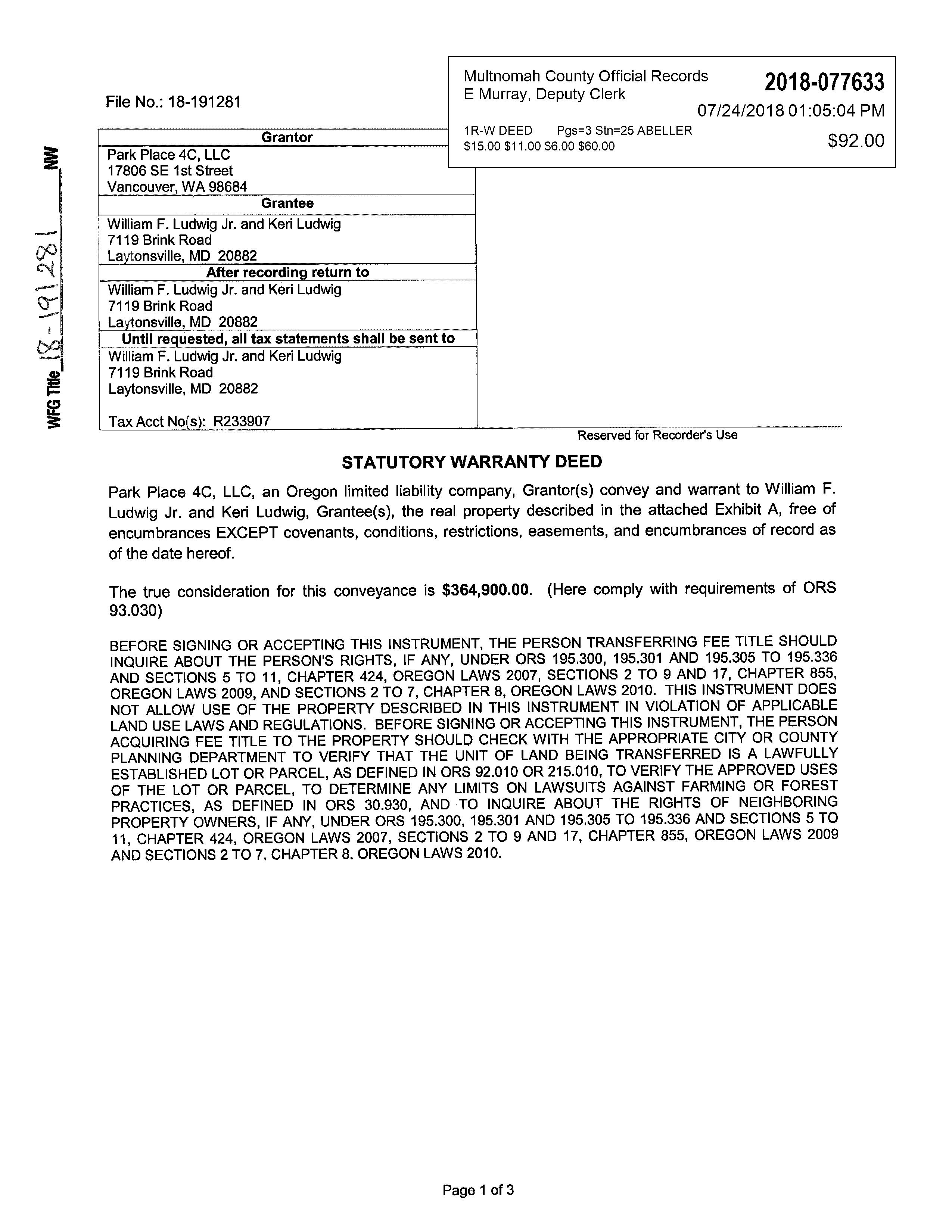 INFORMATION Owner Name LUDWIG,WILLIAMFJR&LUDWIG,KERI Mailing Address 2245SWPARKPL#4CPORTLAND,OR97205