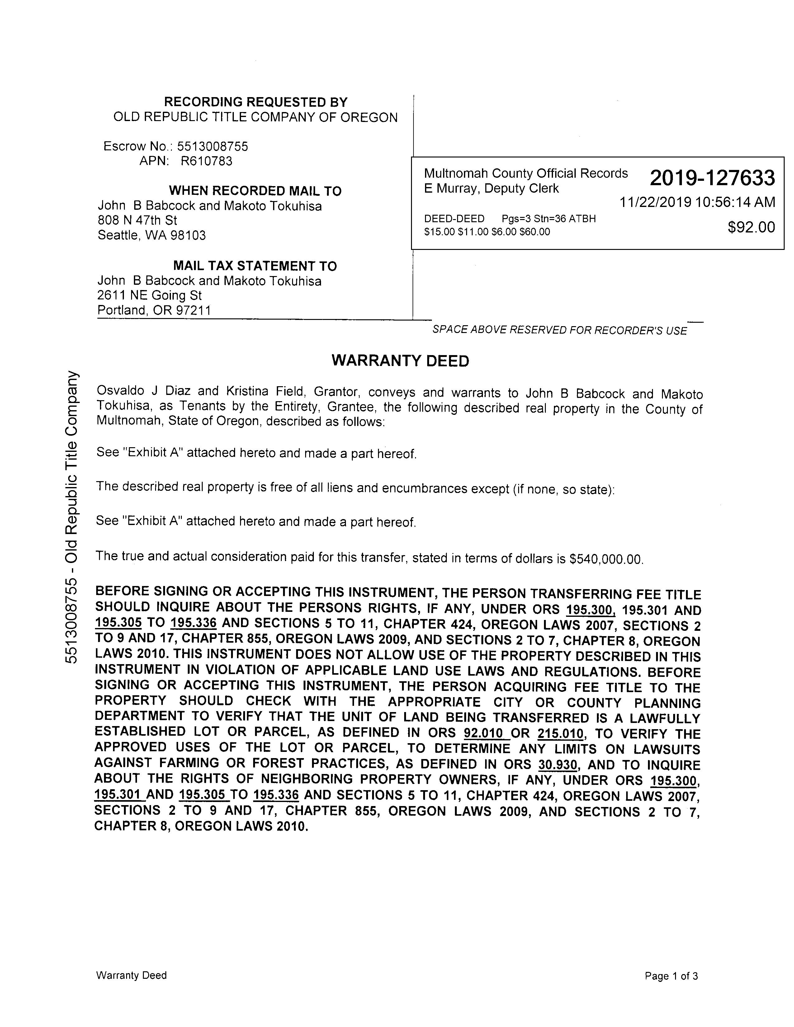 Owner:Babcock, John B Tokuhisa, Makoto 2611 NE Going St