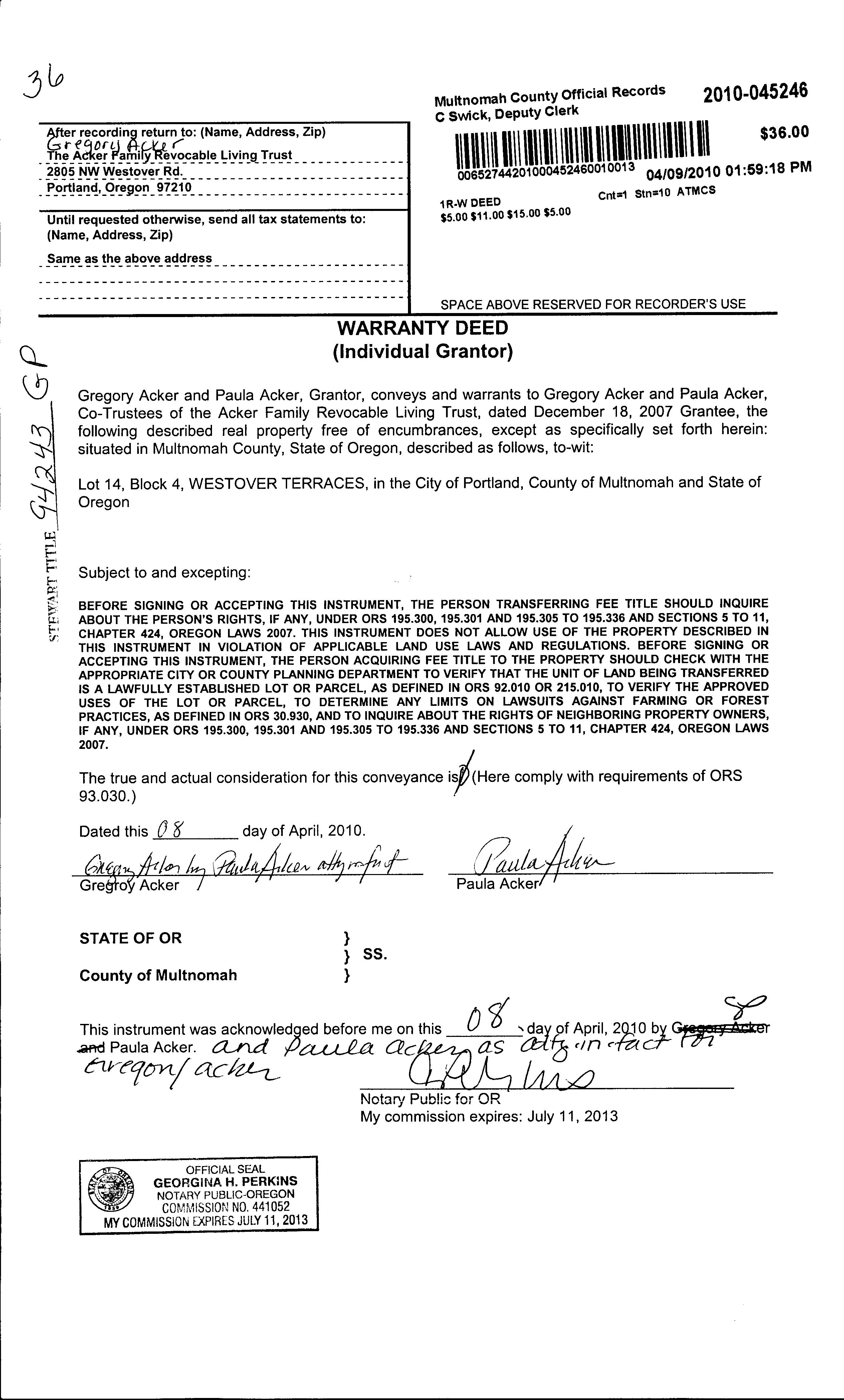 Grantor:ACKERGREGORY&PAULA