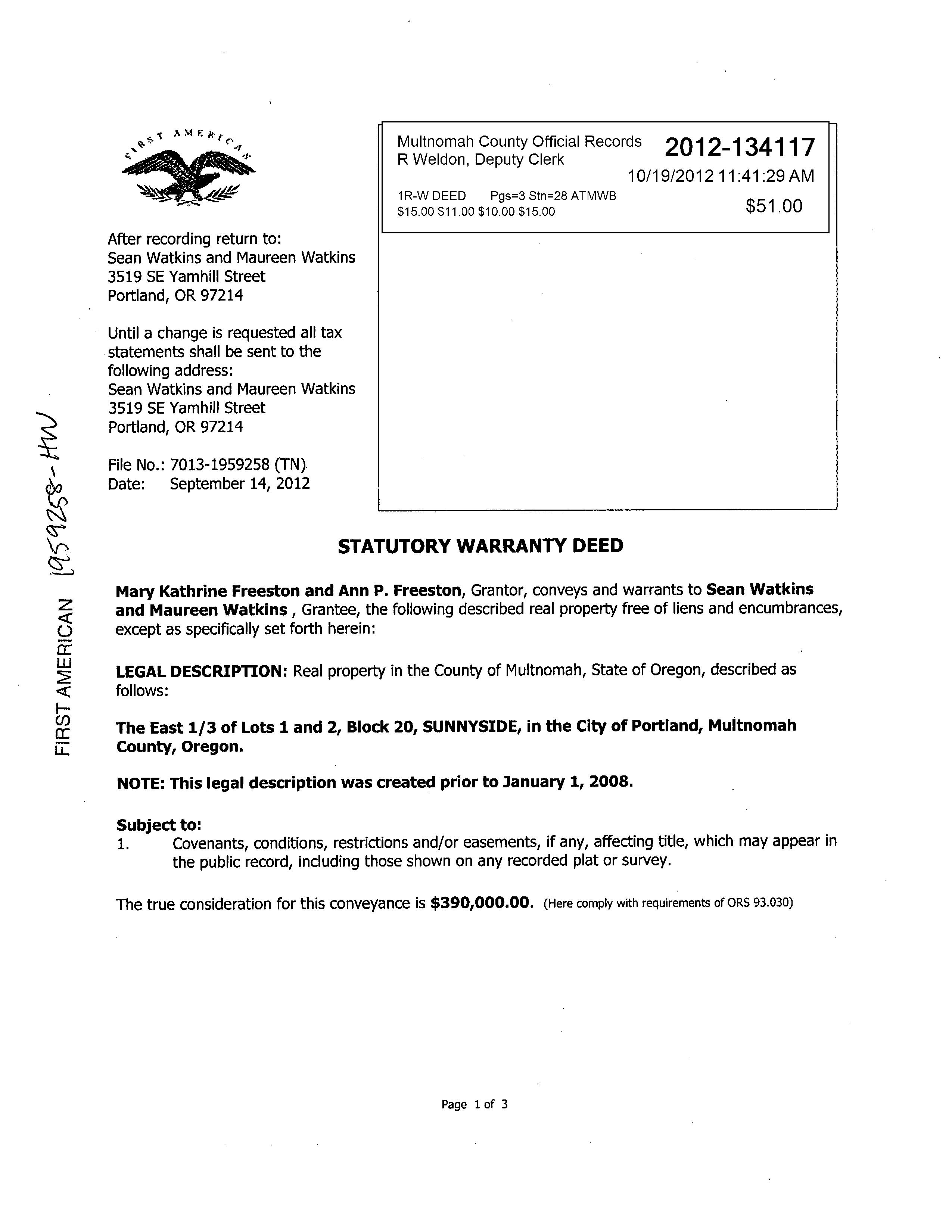 Grantor:FREESTON MARYK &ANN P