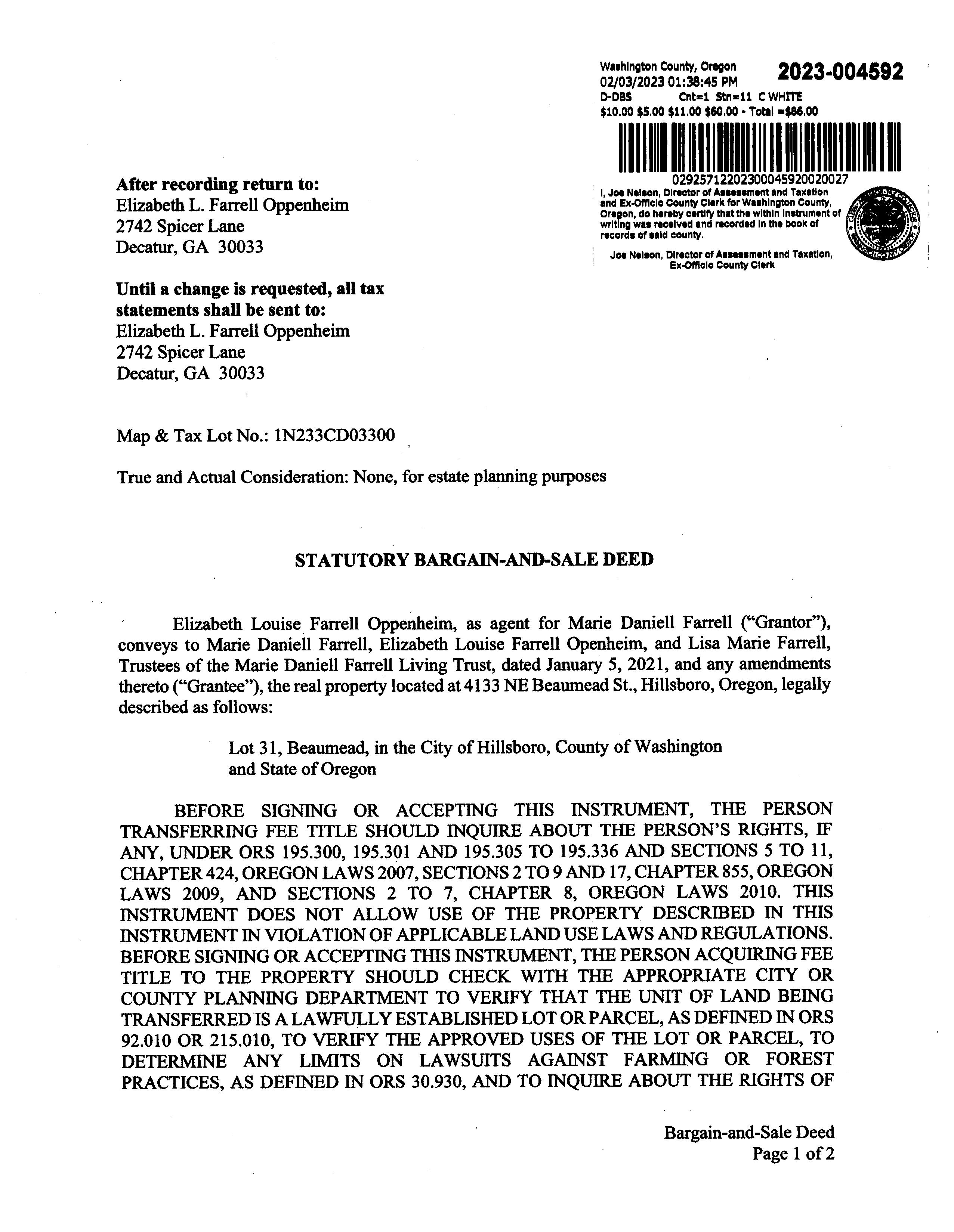 Property Owner Property Address 2023RealMarketValue R724078 FARRELL,MARIEDANIELL LIVTRUST 4133NEBEAUMEAD ST, HILLSBORO,OR97124 $461,210 PropertyPage: Details 2024GENERALINFORMATION Property Status A Active Property Type Residential LegalDescription BEAUMEAD, LOT 31, ACRES 0.17 AlternateAccount NumberNeighborhood ESTM EAST MAIN IN HILLSBORO Map Number 1N233CD03300 Property Use 1010: RESIDENTIAL IMPROVED Levy Code Area 007.01 2023 Certi ed TaxRate 16.8476 2024OWNERINFORMATION Owner Name FARRELL, MARIE DANIELL LIV TRUST Mailing Address 619 KINGS BRG NE ATLANTA, GA 30329 RELATED PROPERTIES Linked PropertiesPropertyGroupIDGrouped PropertiesSplit / MergeDateSplit /MergeAccountsSplit / MergeMessage2023IMPROVEMENTS Expand/CollapseAll 2023LANDSEGMENTS STATE CODE SEGMENT TYPE LAND SIZE L1 01:SGLFAM IMPHS 0.17acres TOTALS 0.17acres CERTIFIED / IN PROCESS VALUES YEAR IMPROVEMENTS LAND RMV SPECIAL USE ASSESSED VALUE 2023 $232,120 $229,090 $461,210 $0 $205,510 2022 $227,420 $218,180 $445,600 $0 $175,450 SALES HISTORY SALE DATE SELLER BUYER INST # SALE PRICE INST TYPE FARRELL,MARIED FARRELL,MARIE DANIELL LIV TRUST 2023004592 - DBS FARRELL, CHARLESS & FARRELL,MARIED FARRELL,MARIED 2023004591 - DC 8/5/1990 IBACH,VICTORIA M FARRELL, CHARLESS & FARRELL,MARIED 1990042871 $67,500 DW 6/1/1985 IBACH,VICTORIA M 1985024133 $55,000 UNK Improvement #1 Improvement Type Beds/Baths - Single-Family Residence 3/ 2 Sketch Improvement #2 Improvement Type Beds/Baths - Non-Building 0/ 0 Sketch Improvement #3 Improvement Type Beds/Baths - Non-Building 0/ 0 Sketch