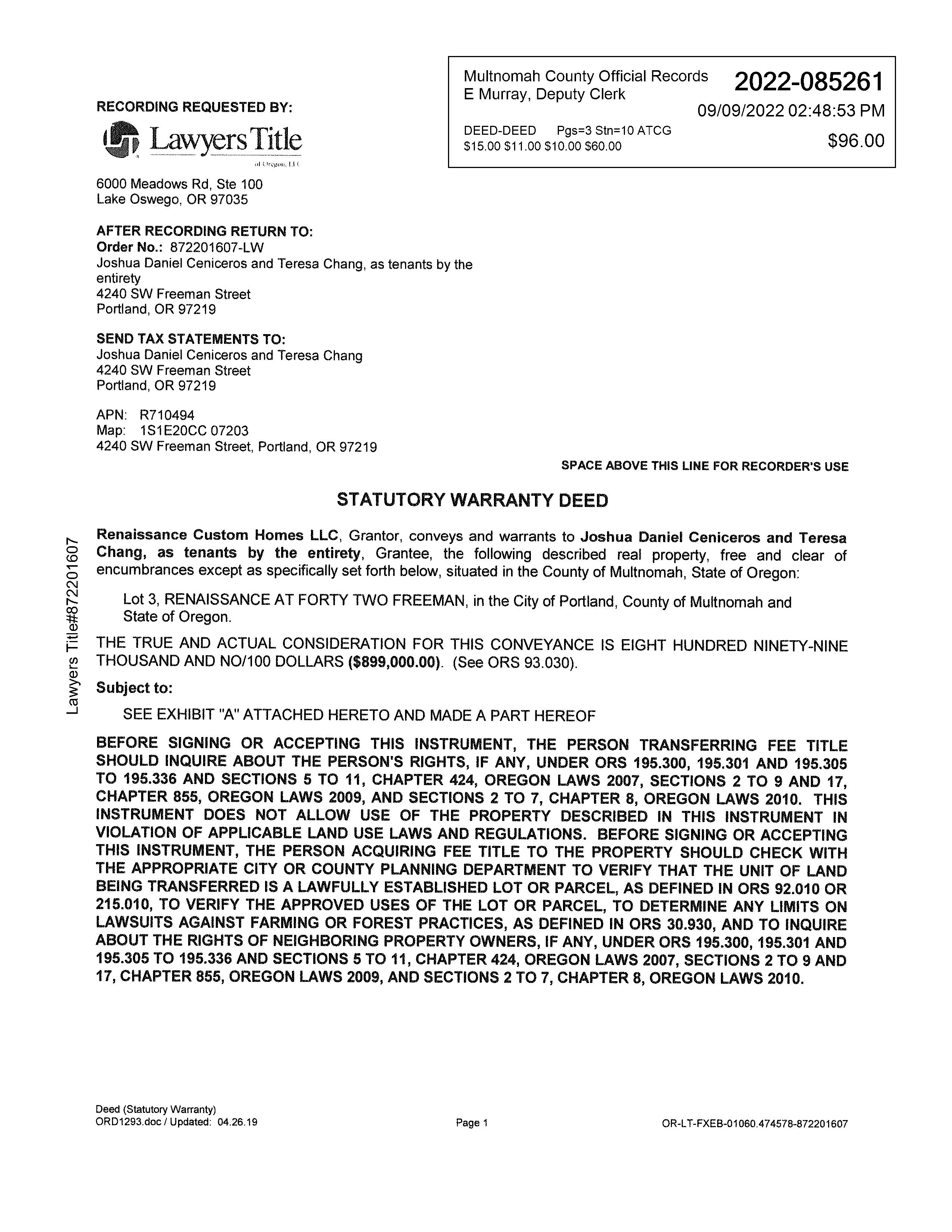 Owner:Ceniceros, Joshua D Chang, Teresa 4240 SW Freeman St Portland OR 97219