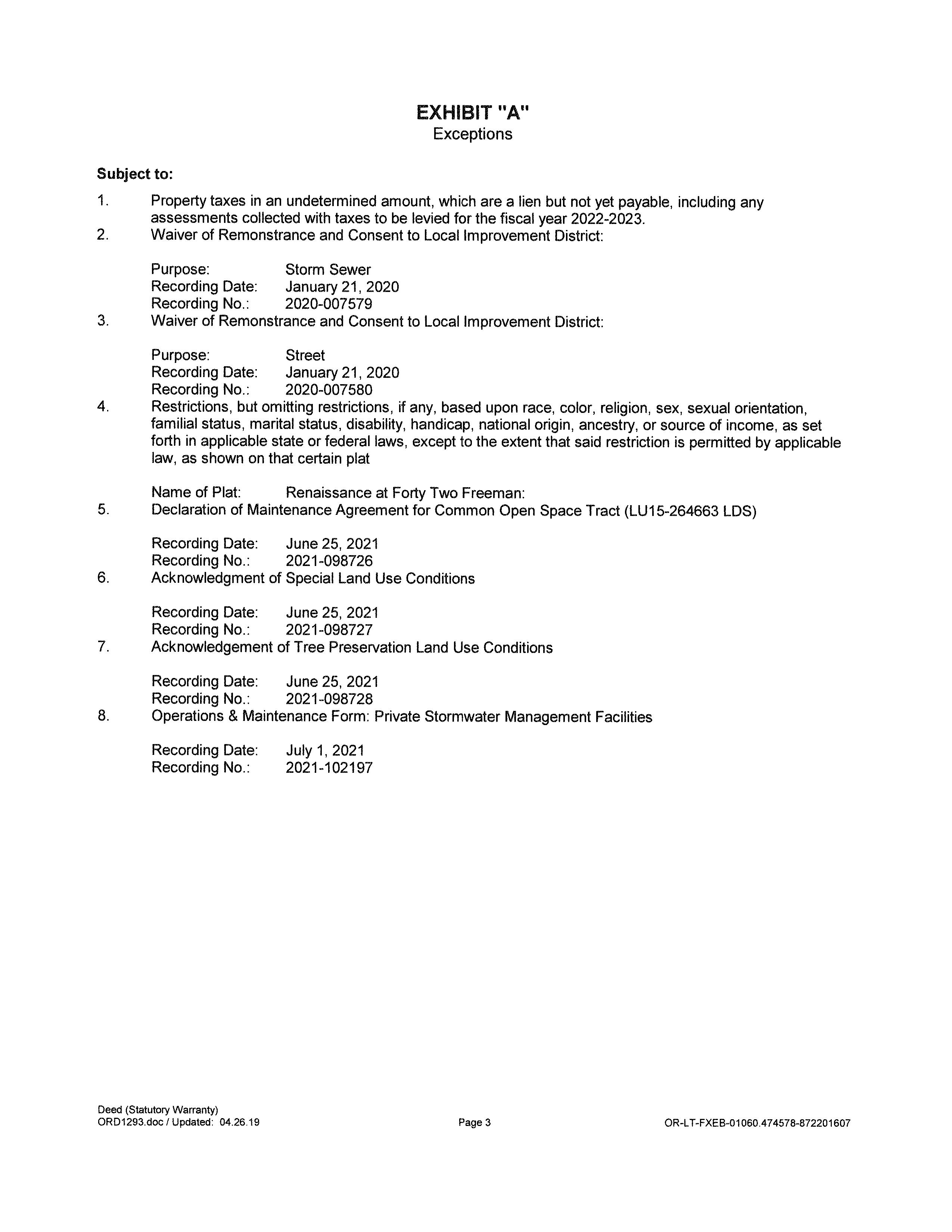 RENAISSANCE AT FORTY TWO FREEMAN, LOT 3, INC UND INT TRACT A