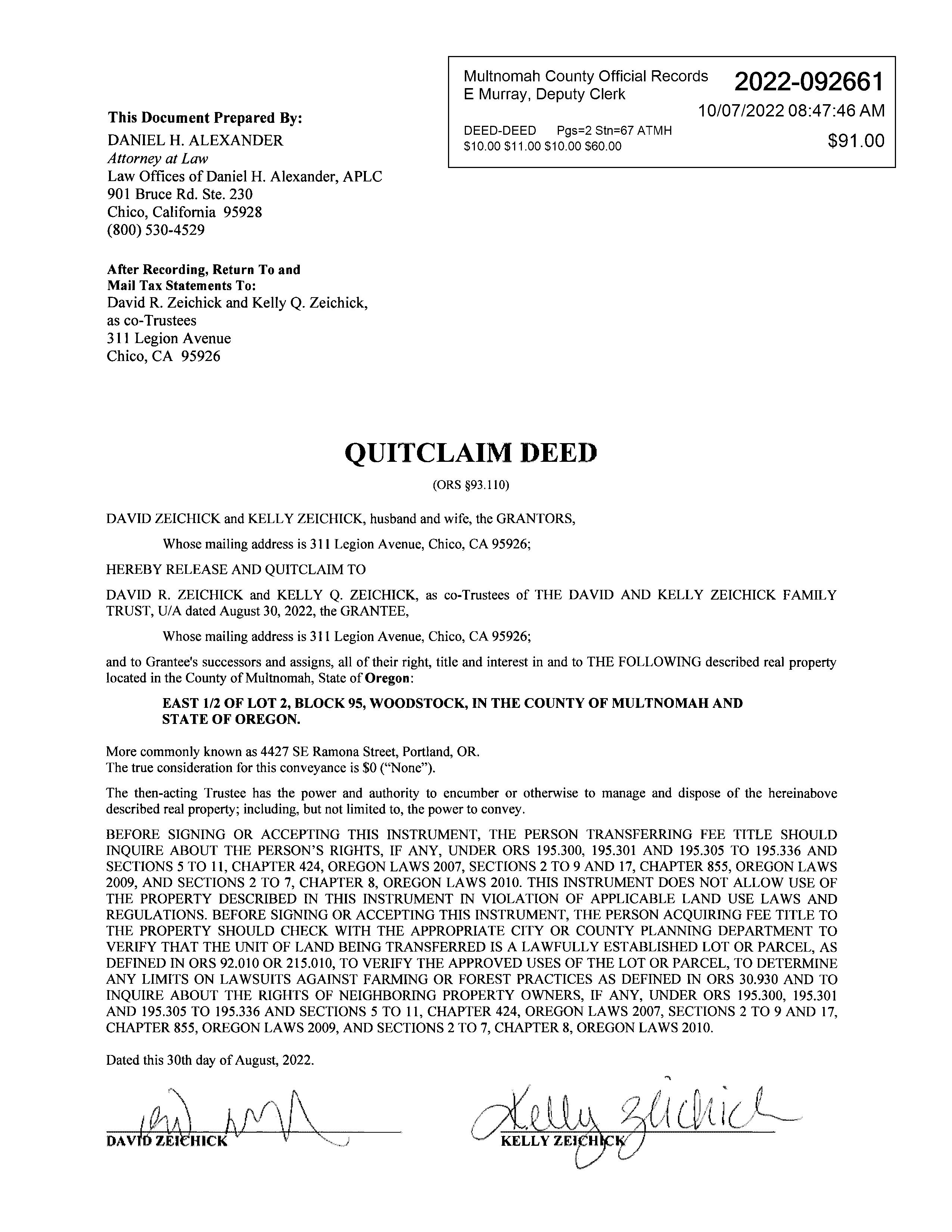 Property Owner Property Address 2023AssessedValue R313003 DAVID&KELLYZEICHICKFAMILYTR&ZEICHICK,JOYK 4427SERAMONAST,PORTLAND,OR97206 $235,920 GENERALINFORMATION Property Status AActive Property Type RPResidential Legal Description WOODSTOCK,BLOCK95,E1/2OFLOT2 Alternate Account Number R928906310 Neighborhood RB3109 Eastmoreland Heights Map Number 1S2E18CB-13400 Property Use B-RESIDENTIALIMPROVED LevyCodeArea 201 OWNERINFORMATION Owner Name DAVID&KELLYZEICHICKFAMILYTR& ZEICHICK,JOYK Mailing Address 311LEGIONAVECHICO,CA95926 RELATEDPROPERTIES Split/Merge data prior to February 6, 2018 is not available online, please call Multnomah County Assessment & Taxation division. Linked PropertiesProperty Group IDGrouped PropertiesSplit / Merge DateSplit / Merge AccountsSplit / Merge MessageIMPROVEMENTS ? Expand/Collapse All LANDSEGMENTS LANDNO LANDTYPE LANDSIZE L1 RESRESIDENTIALLAND 5,000Sq.ft TOTALS 5,000Sq.ft/0.11acres ASSESSEDVALUES YEAR IMPROVEMENTS LAND SPECIALMARKET/USE RMV M5VALUE EXEMPTIONS M50ASSESSED 2023 $362,510 $280,000 $0 / $0 $642,510 $642,510 $235,920 2022 $351,880 $278,000 - / - $629,880 $629,880 $229,050 2021 $331,680 $253,000 - / - $584,680 $584,680 $222,380 2020 $285,970 $233,000 - / - $518,970 $518,970 $215,910 2019 $275,340 $228,000 - / - $503,340 $503,340 $209,630 2018 $283,810 $228,000 - / - $511,810 $511,810 $203,530 2017 $301,330 $203,000 $0 / $0 $504,330 $504,330 $197,610 2016 $246,550 $193,000 - / $0 $439,550 $439,550 $191,860 2015 $230,130 $144,000 $0 / $0 $374,130 $374,130 $186,280 2014 $166,270 $127,000 $0 / $0 $293,270 $293,270 $154,680 2013 $148,690 $115,000 $0 / $0 $263,690 $263,690 $150,180 ? Improvement #1 Improvement Type Building Type Class - SINGLEFAMILYRESIDENTIAL 1STYW/ATTIC&BSMT 3.0